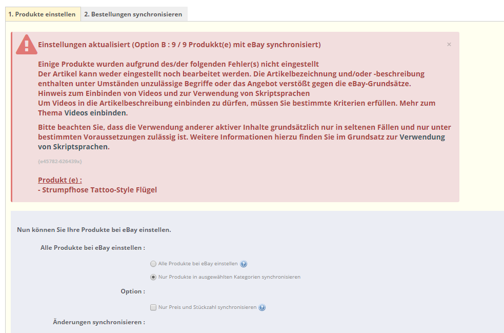 Gohan Posted April 6, 2015 Author Share Posted April 6, 2015 (edited) Darf ich nochmal fragen? Jemand das ding zum laufen bekommen? Die Entwickler melden sich nicht zu dieser Thematik. Ich dachte Prestashop und eBay sind so eng verstrickt miteinander? Das ist ja nun auch kein kleines Argument und wird ja auch beworben. Ich habe jetzt mal alle Artikel aus dem Shop (122) importiert statt nur eine Kategorie, aber in eBay an sich sind nur 2, wieso auch immer nur 2..... Die haben auch kein richtiges Bild, sondern das Vorschaubild. Diese eBay Anbindung, sorry ist eine ganz schwache Leistung und ich bin gerade sehr enttäuscht, weil ich alles nochmal neu einstellen muss bei eBay Einstellungen aktualisiert (Option B : 122 / 122 Produkkt(e) mit eBay synchronisiert)Einige Produkte wurden aufgrund des/der folgenden Fehler(s) nicht eingestelltDer Artikel kann weder eingestellt noch bearbeitet werden. Die Artikelbezeichnung und/oder -beschreibung enthalten unter Umständen unzulässige Begriffe oder das Angebot verstößt gegen die eBay-Grundsätze. Hinweis zum Einbinden von Videos und zur Verwendung von Skriptsprachen Um Videos in die Artikelbeschreibung einbinden zu dürfen, müssen Sie bestimmte Kriterien erfüllen. Mehr zum Thema Videos einbinden. Bitte beachten Sie, dass die Verwendung anderer aktiver Inhalte grundsätzlich nur in seltenen Fällen und nur unter bestimmten Voraussetzungen zulässig ist. Weitere Informationen hierzu finden Sie im Grundsatz zur Verwendung von Skriptsprachen. {e457[spam-filter]626439x}Produkt (e) :- Ohrringe ........ Edited April 6, 2015 by Gohan (see edit history) Link to comment Share on other sites More sharing options...