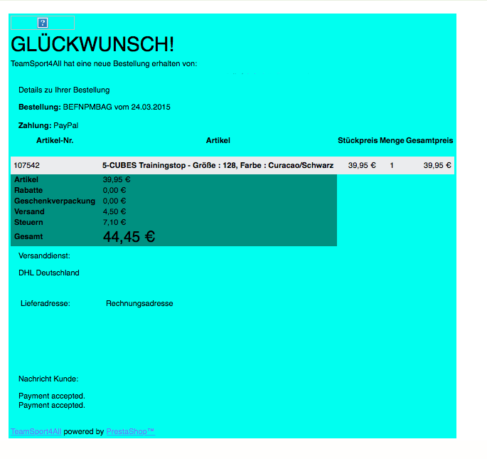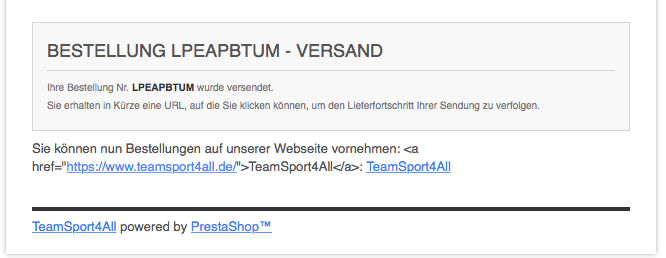 joecool2009 Posted March 24, 2015 Share Posted March 24, 2015 Bei der "Ware versendet"-Mail bekomme ich als Kunde eine komische Mail, da steht ein HTML-Schnipsel sowie eine Aufforderung dass man ab sofort nun bestellen könne, was ja schon lange geschehen ist. Sind da evtl. Teile von der Registrierungsmail reingekommen? Wie kommt sowas und wie kann man am besten und sichersten die Mailtexte abändern? Hätte bei dieser Gelegenheit auch gerne noch den Powered-Footer in den Mails entfernt. Screenshot -> Link to comment Share on other sites More sharing options...