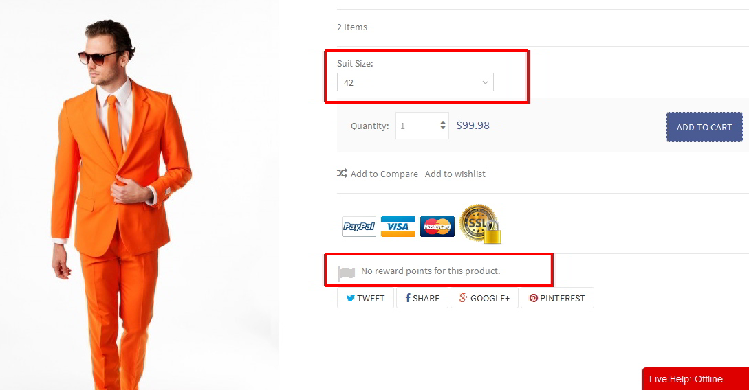 flyclothing Posted March 24, 2015 Share Posted March 24, 2015 I found a possible bug with the loyalty points display when using product options. When you go to the product page, you can see the loyalty points for that product display properly but if you pick any other size option, they disappear. http://www.flyclothing.com/Mens-Clothing/mens-suits/Opposuits-The-Orange-Suit.html I've also included a screenshot. 1 Link to comment Share on other sites More sharing options...