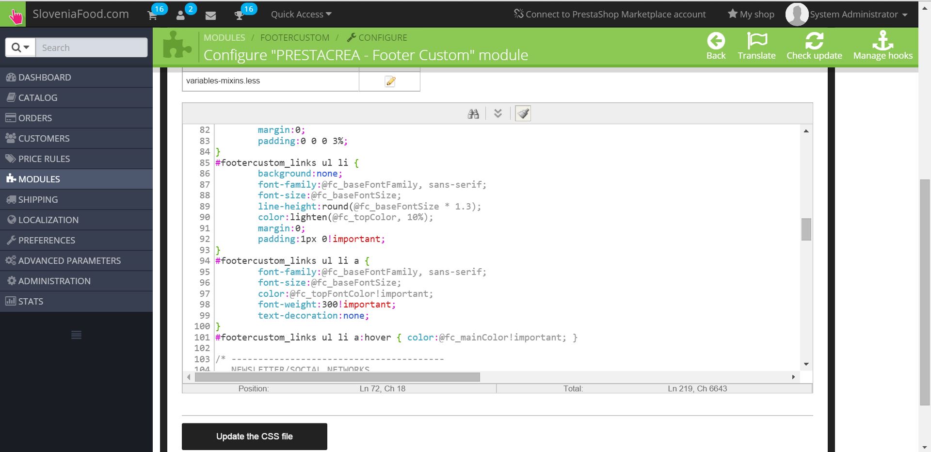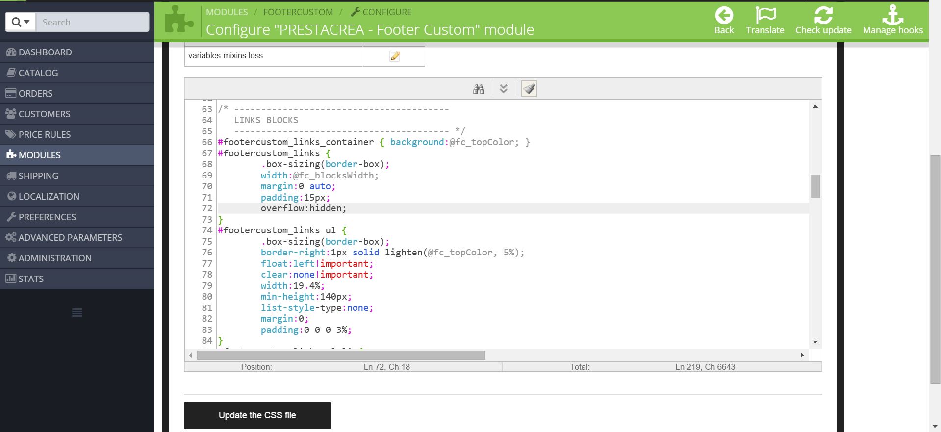 Sandon Posted March 26, 2015 Share Posted March 26, 2015 (edited) Hi people! I have just bought Responsive Footer Custom Module (http://addons.prestashop.com/en/front-office-features-prestashop-modules/888-responsive-footer-custom.html). I would like to temporarily disable Links Blocks because I do not need them. Developer told me to add CSS property "display:none" at "#footercustom_links ul". I have found "#footercustom_links ul" with module CSS editor but I do not where to put "display:none" to disable all Links Blocks. I am new to CSS editing so please tell me exactly what to do that will work properly. Please see attachments two see how it looks like in module CSS editor. Regards, Matias Edited March 26, 2015 by Sandon (see edit history) Link to comment Share on other sites More sharing options...