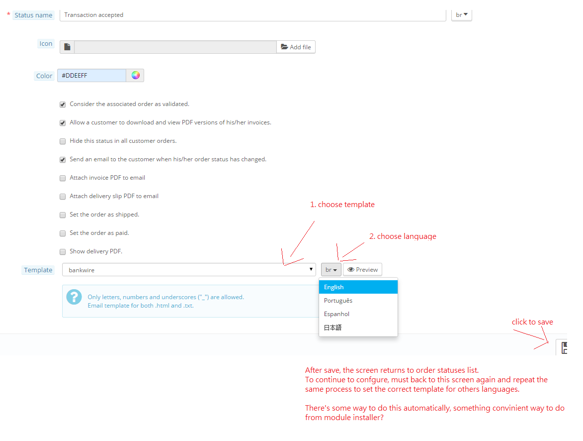 omine Posted March 27, 2015 Share Posted March 27, 2015 (edited) I'm developing a module. I couldn't found on documentation or forums about how to set email template for each order status and languages available. Example I have the following order statuses: 1. processing 2. canceled 3. error 4. accepted I have about 4 languages 1. pt 2. ja 3. es 4. en I want set programmatically, from module installer, all statuses and its mail templates Sample: $states = array( 'MODULE_OS_ACCEPTED' => array( 'label'=>'Transaction accepted', 'icon'=> 'module_os_accepted', 'send_email'=>true, 'color'=>'#DDEEFF', 'hidden'=>false, 'delivery'=>false, 'logable'=>true, 'invoice'=>true, ), 'MODULE_OS_PROCESSING' => array( 'label'=>'Transaction in process', 'icon'=>'module_os_processing', 'send_email'=>false, 'color'=>'#FFCC66', 'hidden'=>false, 'delivery'=>false, 'logable'=>true, 'invoice'=>false, ), ); foreach( $states as $k => $v ) { if (!Configuration::get($k)) { $order_state = new OrderState(); $order_state->name = array(); foreach (Language::getLanguages() as $language) { $order_state->name[$language['id_lang']] = $v['label'] . ' ('.$this->displayName.')'; } $order_state->send_email = $v['send_email']; $order_state->color = $v['color']; $order_state->hidden = $v['hidden']; $order_state->delivery = $v['delivery']; $order_state->logable = $v['logable']; $order_state->invoice = $v['invoice']; $order_state->module_name = $this->name; if ($order_state->add()) { $source = dirname(__FILE__).'/icons/'.$v['icon'].'.gif'; $destination = dirname(__FILE__).'/../../img/os/'.(int)$order_state->id.'.gif'; copy($source, $destination); } Configuration::updateValue($k, (int)$order_state->id); } } At this point, no problem.The order states are being saved on config table. The problem is, i want set the mail template from installer instead of do manually from BO one by one for each language. See the attached, please. Its possible to do something like this? $order_state->mail_template[$language['id_lang']] = 'template_file_name';I checked the OrderState class but there's nothing about mail template settings.[/size] Thanks in advance Edited March 27, 2015 by omine (see edit history) Link to comment Share on other sites More sharing options...