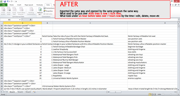 climaticmoments Posted April 1, 2015 Author Share Posted April 1, 2015 Hello Ron,The problem is.. I have over 4000 products with a very fast turn around so I have to update everyday. When I export the products and open them in excel the columns and rows are a mess. I took a screen shot of before and after this started showing up. Before I had just over 4000 lines to edit and now I have 11926 lines because of this, plus it wraps text in excel so I have to delete those lines, unwrap the text, take spaces out, etc. it takes forever. I also took a screen shot of the first product I opened and showed source. I didn't code the extra <br /><br /> or the the <div class=""copyIcon copy0""></div> <div class=""pasteIcon paste0""></div> <div class=""notifyIcon""></div> That is in both long description and short. I have version 1.6.0.14, however I am a victim of the 1.6.0.12 problems and as a result I am missing all the tables and fields added since 1.6.0.9 with no way to roll back using perfect backups from 3 different sources. I can't update products, add products, edit products, put products on sale, etc so I guess 1 thing at a time. I also don't want to start fresh because image mapping was depreciated as of 1.5. Thank you for any help you can offer Ron. Have a nice night. Tina www,climaticmoments.com Link to comment Share on other sites More sharing options...