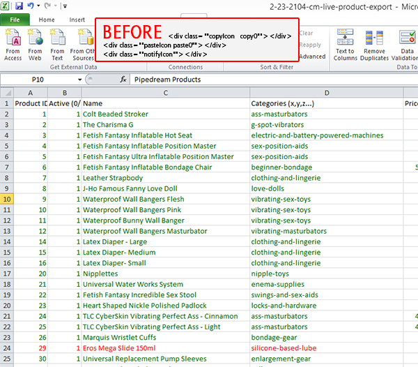 climaticmoments Posted March 28, 2015 Share Posted March 28, 2015 (edited) Hello, I have been pulling my hair out trying to find how, why, or where my pasted text below is coming from. My products export no problem, but it is really messing everything up when I try to open the csv export in excel. It is not visible to customers, but it is messing up my descriptions both short and long and other areas. I am praying someone knows what is producing this and how to get rid of it. This is from one description. <div class=""copyIcon copy0""></div> <div class=""pasteIcon paste0""></div> <div class=""notifyIcon""></div> <div class=""copyIcon copy0""></div> <div class=""pasteIcon paste0""></div> <div class=""notifyIcon""></div> <div class=""copyIcon copy0""></div> <div class=""pasteIcon paste0""></div> <div class=""notifyIcon""></div> <div class=""copyIcon copy0""></div> <div class=""pasteIcon paste0""></div> <div class=""notifyIcon""></div> <div class=""copyIcon copy0""></div> <div class=""pasteIcon paste0""></div> <div class=""notifyIcon""></div> <div class=""copyIcon copy0""></div> <div class=""pasteIcon paste0""></div> <div class=""notifyIcon""></div> <div class=""copyIcon copy0""></div> <div class=""pasteIcon paste0""></div> I appreciate any import or help. Thank you Athena www.climaticmoments.com Edited March 28, 2015 by climaticmoments (see edit history) Link to comment Share on other sites More sharing options...