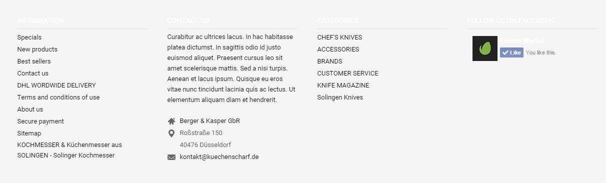 Küchenscharf Posted March 29, 2015 Share Posted March 29, 2015 (edited) Hey everyone! Im little overstrained with editing my footer. See attached picture of my footer. its a little messed up ...How can I change the colour of the Header? How can I change the name of the header to create individual footer categories? How can I remove this sample text over our contact details? In modules - contact information block its not possible How can I remove the follow us on Facebook envato market area?Hope anyone can suport me. Thanks for any help!! Edited March 29, 2015 by Küchenscharf (see edit history) Link to comment Share on other sites More sharing options...