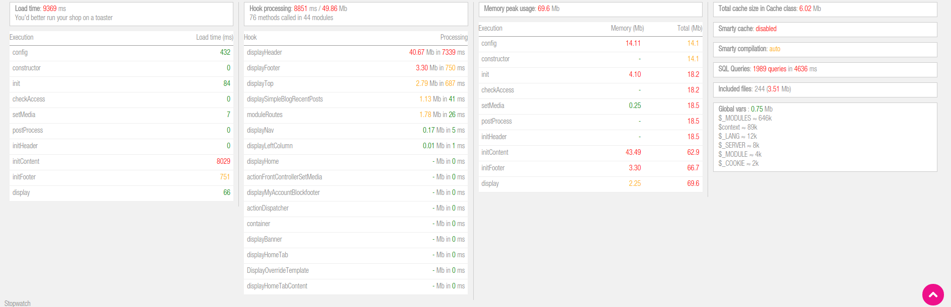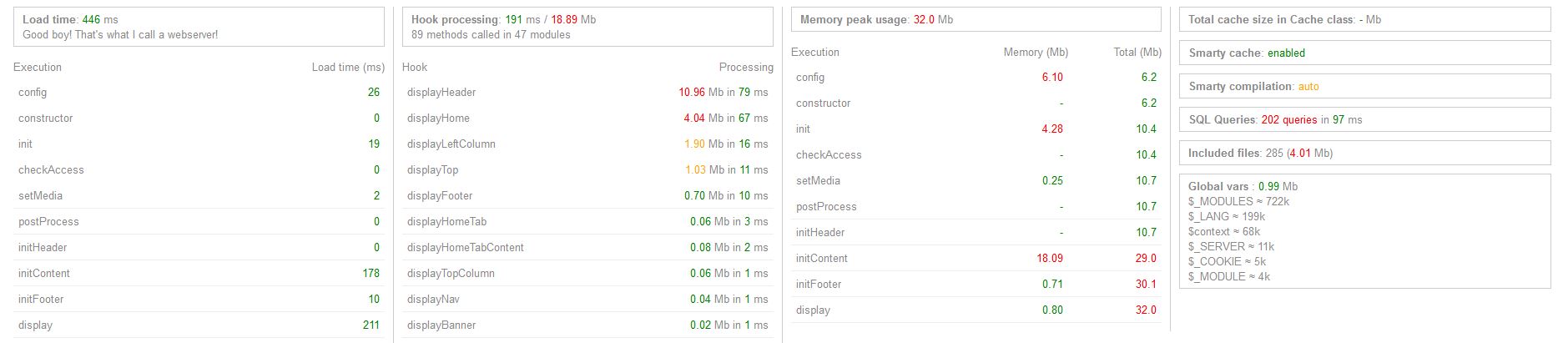 keole Posted March 31, 2015 Author Share Posted March 31, 2015 Bonjour, nous avons tenté toutes ces manipulations et la boutique reste désespérément lente. Je vous met une capture d'écran du début de l'outil de débug / profiling prestashop. Pour cet exemple, seul le Megamenu fourni avec le thème est activé sur la page d'accueil. Il n'y a rien d'autre que le menu d'activé. Merci pour votre aide. Link to comment Share on other sites More sharing options...