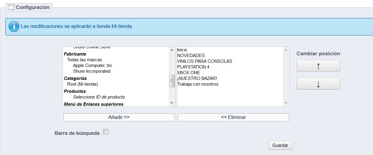 Lo mismo no me expliqué bien, yo lo que quisiera hacer es tener más desplegables en el menú horizontal. Ahora he agrupado todos los vinilos de consolas en una misma categoría y no sé porqué, en el módulo "blocktopmenu" no puedo elegir las categorías que tengo a la izquierda de la web para "desplegarlas". Ahora, después de éstas agrupaciones nuevas, solo tengo como "desplegables" la que he hecho nueva "Vinilos para Consolas" y la antigua "Merchandising"... y me pregunto: y las otras "categorías desplegables" donde están? antes al menos desde el módulo las añadía y se desplegaban, pero ahora ni salen en la ventanilla izquierda... esto cómo se puede solucionar?