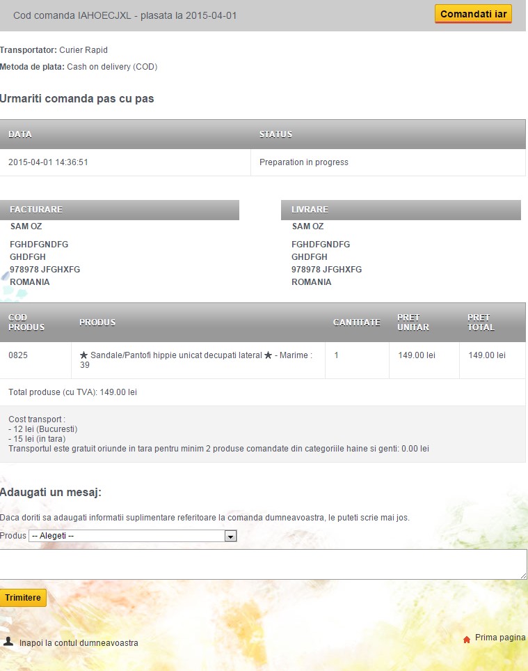tancredx Posted April 1, 2015 Share Posted April 1, 2015 (edited) Salut, Nu stiu daca s-a mai lovit cineva de problema asta, pentru ca nu am gasit nici o discutie in forum referitoare la ea, asa ca intreb eu. ................................. Am activat "Returnarile de produse" (RMA) din BackOffice, din meniul "Comenzi", in ideea de a se putea face returnari de produse de catre clienti. Procedura din punctul de vedere al unui client este urmatoarea: - se logheaza in cont pe site - intra pe "Istoric comenzi" - da clic pe o comanda deja facuta - bifeaza casuta din dreptul produsului comandat - are mai jos o rubrica "Returnari produse" sau "RMA" unde poate lasa si un comentariu in legatura cu motivul pentru care face retur - apoi da click pe butonul "Make an RMA slip"....si cam asta e tot. Problema mea este ca atunci cand intru pe o comanda din "Istoric comenzi", nu imi apare nici casuta aceea de bifat din dreptul produsului comandat, nici rubrica "Returnari produse" cu acel camp in care se poate lasa un comentariu si nici butonul "Make an RMA slip". Am atasat si o captura de ecran cu detaliile la care m-am referit. Stie cineva daca pot fi activate din alta parte si cum pot face pentru a activa acest modul de Returnari produse? Multumesc! Edited April 1, 2015 by tancredx (see edit history) Link to comment Share on other sites More sharing options...
