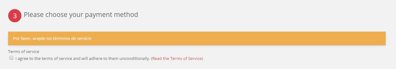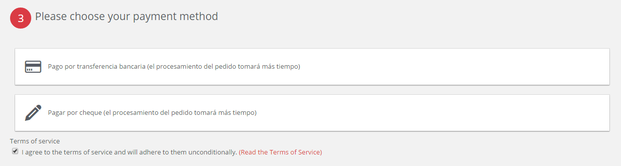 ventura Posted April 2, 2015 Share Posted April 2, 2015 (edited) No hay que cambiar nada en controladores ni js. Haz esto en {if $conditions AND $cms_id} <p class="carrier_title">{l s='Terms of service'}</p> <p class="checkbox"> <input type="checkbox" name="cgv" id="cgv" value="1" {if $checkedTOS}checked="checked"{/if} /> <label for="cgv">{l s='I agree to the terms of service and will adhere to them unconditionally.'}</label> <a href="{$link_conditions|escape:'html':'UTF-8'}" class="iframe" rel="nofollow">{l s='(Read the Terms of Service)'}</a> </p> {/if} Cambia value="1" y pon el value en "0", asi por defecto te mostrara el mensaje de error de que aceptes las condiciones, al acertarlas te apareceran los metodos de pago Edited April 2, 2015 by ventura (see edit history) Link to comment Share on other sites More sharing options...