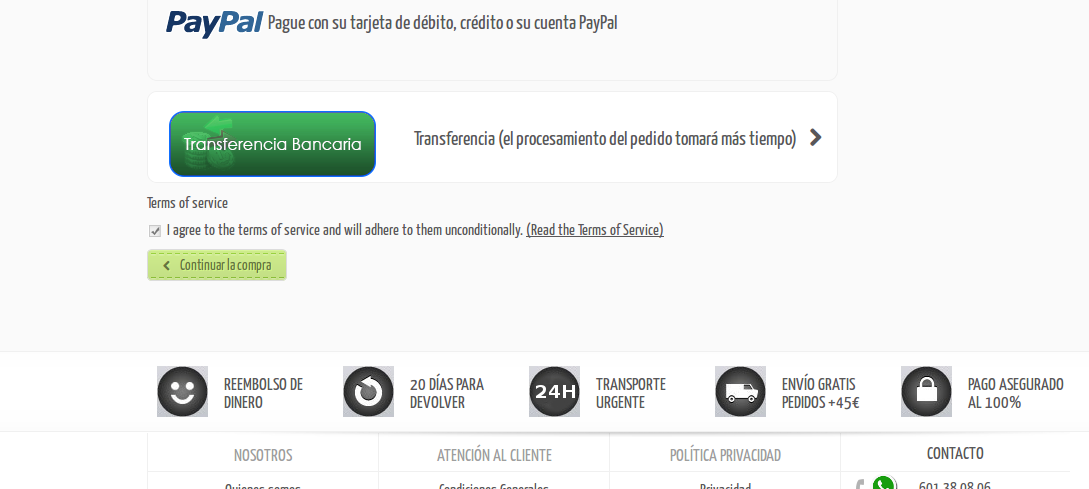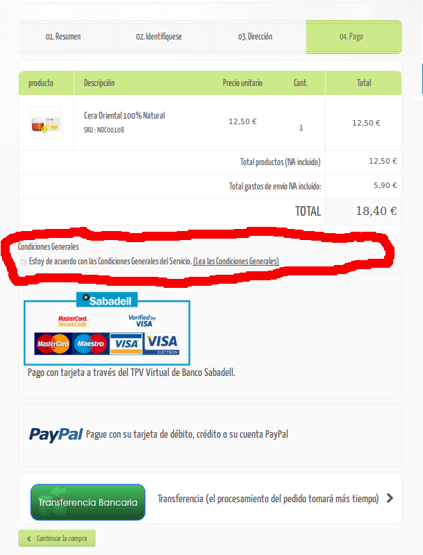 guelu Posted April 2, 2015 Author Share Posted April 2, 2015 Adjunto el final del código de mi order-carrier.tpl por si pudiera ayudar: </div> <!-- end order-detail-content --> {/if} <!-- meto el checkbox aquí --> {if $conditions AND $cms_id} <p class="carrier_title">{l s='Condiciones Generales'}</p> <p class="checkbox"> <input type="checkbox" name="cgv" id="cgv" value="0" {if $checkedTOS}checked="checked"{/if} /> <label for="cgv">{l s='Estoy de acuerdo con las Condiciones Generales del Servicio.'}</label> <a href="{$link_conditions|escape:'html':'UTF-8'}" class="iframe" rel="nofollow">{l s='(Lea las Condiciones Generales)'}</a> </p> {/if} <!-- Fin del checkbox--> {if $opc}<div id="opc_payment_methods-content">{/if} <div id="HOOK_PAYMENT"> {$HOOK_PAYMENT} </div> {if $opc}</div> <!-- end opc_payment_methods-content -->{/if} {else} <p class="alert alert-warning">{l s='No payment modules have been installed.'}</p> {/if} {if !$opc} <p class="cart_navigation clearfix"> <a href="{$link->getPageLink('order', true, NULL, "step=1")|escape:'html':'UTF-8'}" title="{l s='Previous'}" class="button-exclusive btn btn-default"> <i class="icon-chevron-left"></i> {l s='Continue shopping'} </a> </p> {else} </div> <!-- end opc_payment_methods --> {/if} </div> <!-- end HOOK_TOP_PAYMENT --> Por otro lado adjunto una imagen de la web donde puede verse el checkbox desmarcado y los métodos de pago. Aun estando desmarcado puede terminarse sin problema el proceso de compra... Gracias! Link to comment Share on other sites More sharing options...