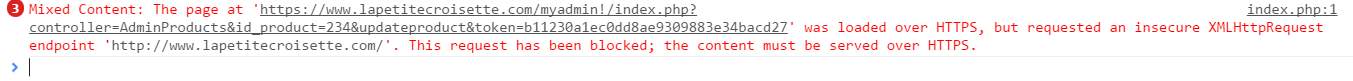 amar.prestashop Posted April 2, 2015 Share Posted April 2, 2015 Hi, I don`t know why but after moving my website to another provider i got an error when i try to upload images in my products. I tested the solution under different posts but my case is different because is related to https, when i try to upload an image this is the error: Mixed Content: The page at 'https://www.lapetitecroisette.com/myadmin!/index.php?controller=AdminProducts&id_product=234&updateproduct&token=b11230a1ec0dd8ae9309883e34bacd27' was loaded over HTTPS, but requested an insecure XMLHttpRequest endpoint 'http://www.lapetitecroisette.com/'. This request has been blocked; the content must be served over HTTPS. I understand that the problem is related to the security issue due to load files through http instead https but i`ve no idea how to fix it. Do you have any clue ? Thanks for your help, Regards Link to comment Share on other sites More sharing options...