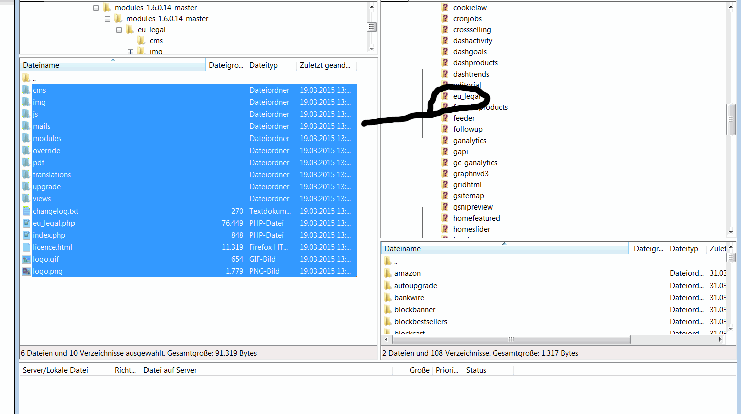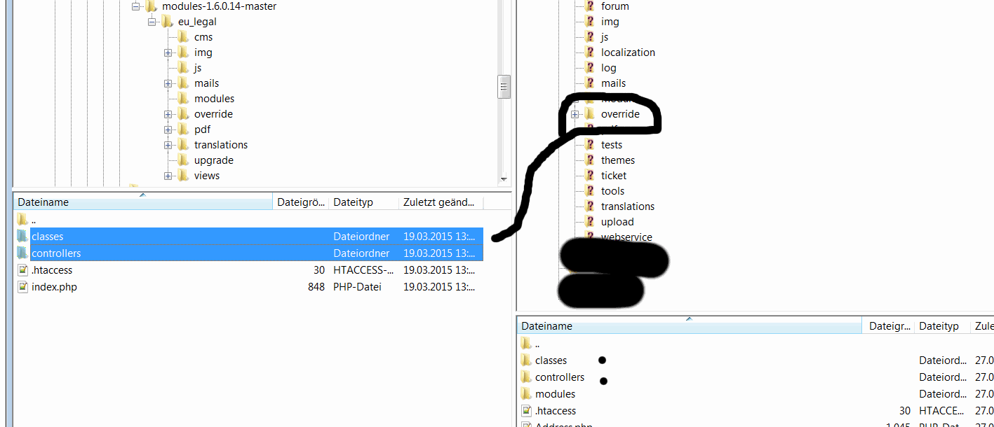 klasjulius Posted April 2, 2015 Author Share Posted April 2, 2015 dann versuch ichs mal: Du has Eu-Legal passend zur Version? Du lädst alle Dateien aus dem Modul eu_legal in den Odner modules/eu_legal eulegal 1.png dann lädst Du die beiden override-ordner classes und controllers aus dem Eu-Legal in das Stammverzeichnis (root)/overrides eulegal 2.png jetzt sollte eu_legal korrekt funktionieren; nur noch die Einstellungen nochmal durchspeichern, template kompilieren , cache leeren und alles testen Für die Email-tests noch eine kleine Besonderheit: auch den cache des email-clienten löschen, z.B. Thunderbird: Extras - Einstellungen - Netzwerk&Speicherplatz Speicherplatz leerenerst erst mal danke für die Antwort. Alles aus deiner Anleitung installiert, funktioniert aber noch nicht. der Patzhalter {cms_legal} s.B. ist immer noch leer. In der Antwortemail der Neuanmeldung, steht unten nur {cms_legal} Link to comment Share on other sites More sharing options...