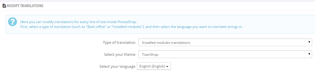HeyVoOn Posted April 4, 2015 Share Posted April 4, 2015 Setting up my prestashop with 3rd party TitanSHop theme. For some unknown reason. Back and front end menus, options and lots of other things are missing english "translations". Go figure! If I go to Modify translations and choose per example; I see... I find myself having to copy from left and paste into the empty red fields on the right to get back the english everywhere! There must be a better way or something because this is getting insane! There are too many translations left and it's NOT really translation since it's already in english on the left! This also is happening with core content and modules. Could anyone please help? Thank you all in advance. Link to comment Share on other sites More sharing options...