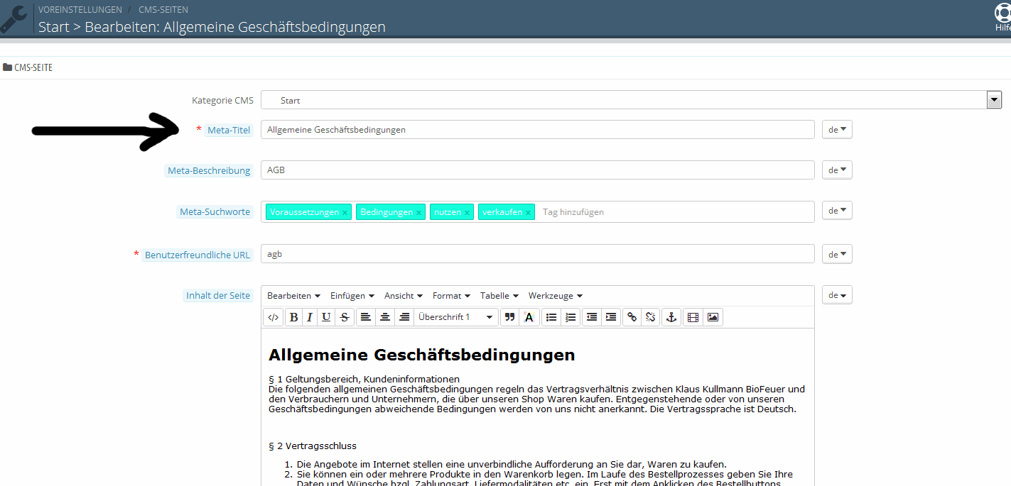post-910594-0-25203800-1428343993_thumb.pngpost-910594-0-04353600-1428344002_thumb.pngNee. Das meine ich nicht. Hab ich gefunden, ist ja klar. Ich habe eine CMS, die hat einen Titel (Aviso legal) Die ist verlinkt mit der Kaufbedingung die man anklicken muss wenn man kauft. Der Link funktioniert aber da steht das Falsche da, obwohl der Titel richtig ist auf der CMS Seite. Siehe Bild 1 und 2