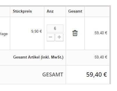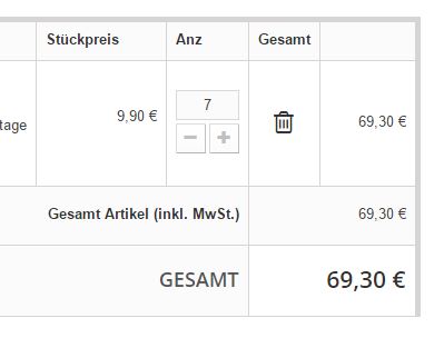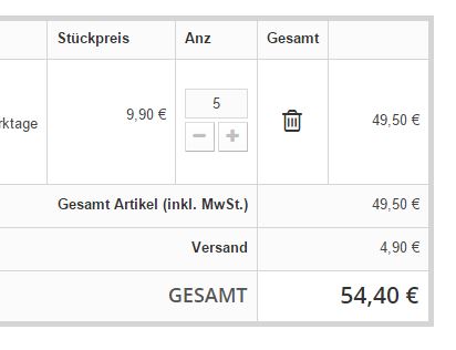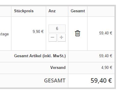 kalua Posted April 6, 2015 Share Posted April 6, 2015 (edited) Hey all I got a strange problem which seems to be an error by script calculating. Therefor before some background data ... I made a card rule that shipping will be free for orders over 50,- incl. tax. Take a look step by step ... 1. At this screenshot everythings fine 2. Now I added one more piece via the "+" button. As you can see, the amount is over 50,- incl. tax but the shipping is still displayed but not calculated. 3. Added another piece via "+" and everythings correct. 4. Now I reduced one piece "-" back to 6 items and it is the same status like the second one from the top. But now the shipping is not displayed like it it correct. Any idea how to solve the problem or from where it comes from? PS 1.6.0.11 Edited April 6, 2015 by kalua (see edit history) Link to comment Share on other sites More sharing options...