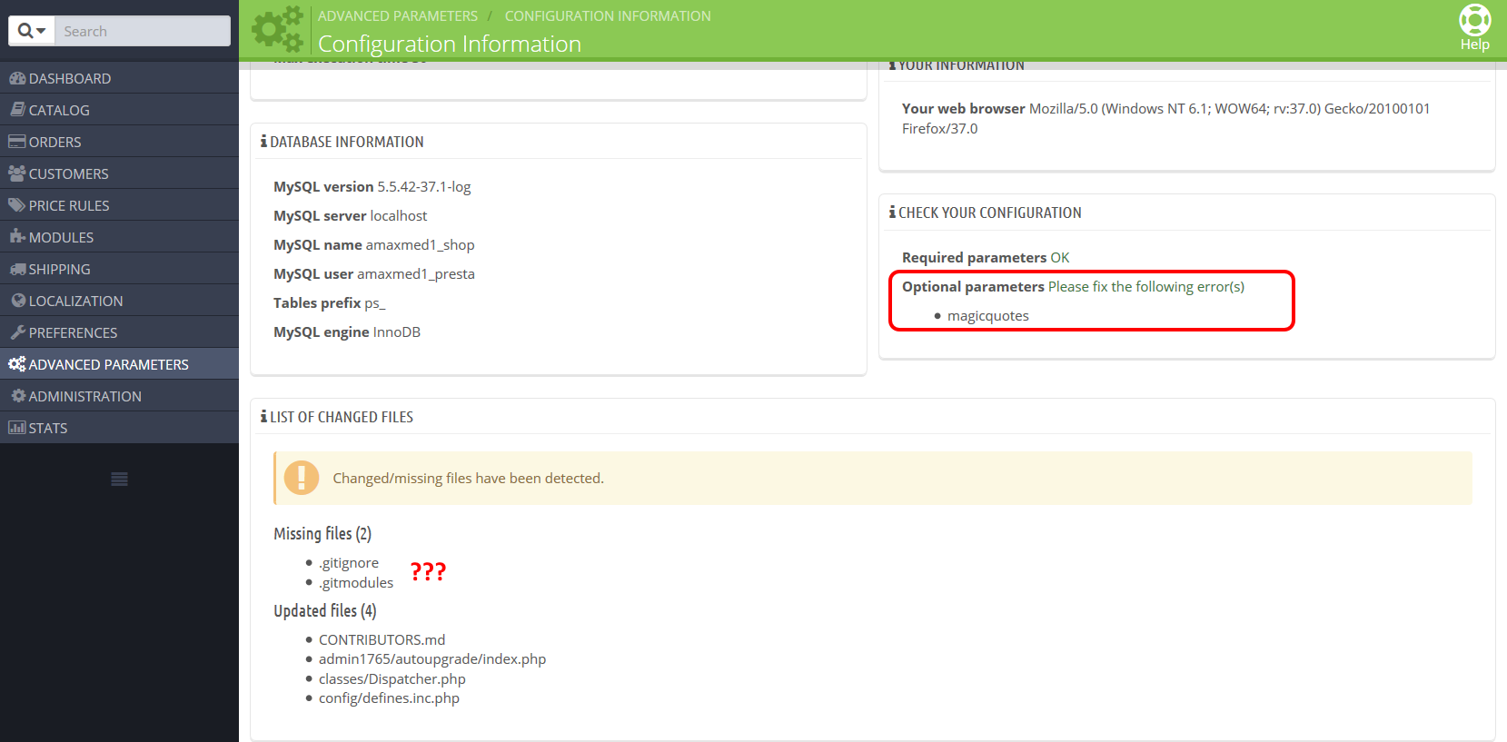 papagino Posted April 9, 2015 Author Share Posted April 9, 2015 (edited) Hello again Nemo1 When I check the "Configuration information" under "Advanced Parameters" in my backoffice, I noticed that under "Please fix the following error(s)" , magicquotes was mentionned. I turned magicquotes to off in the php.ini file and the warning shown in the picture in now gone. Also, it shows that I am missing 2 files: .gitignore and .gitmodules? Any ideas what are those files? See pics for details: Cheers Dan Edited April 9, 2015 by papagino (see edit history) Link to comment Share on other sites More sharing options...