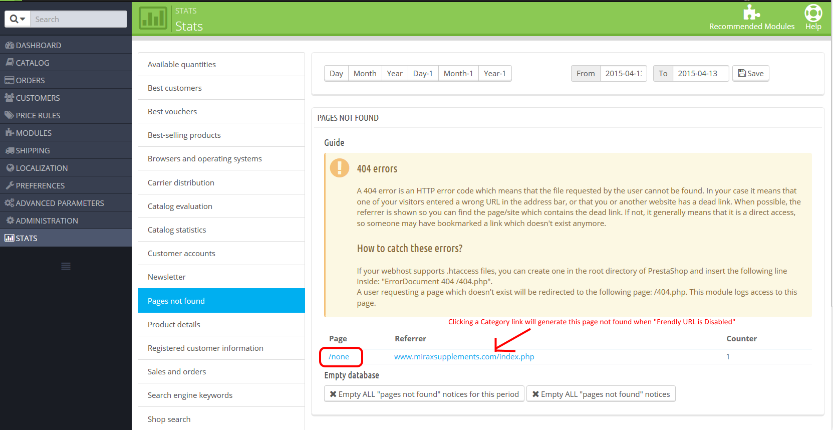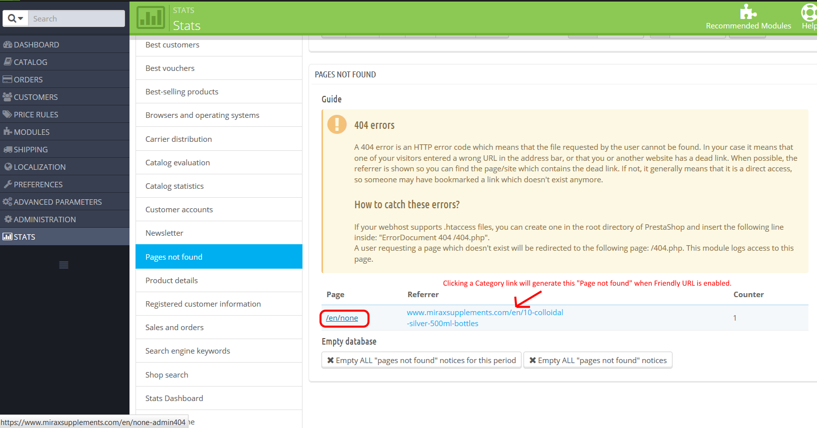 papagino Posted April 13, 2015 Author Share Posted April 13, 2015 (edited) Hi Nemo1, Ok, here's what I did, I place the shop under maintenance, disabled friendly urls then emptied all "pages not found" notices in the BO. Now, the only "pages not found" notice I will get is "/none" with "www.miraxsupplements.com/index.php" as the "Referrer", even though I did not click on any links pointing to the shop homepage, only a Category link? (There is no URL rewrite assigned to my homepage under "Preferences/SEO & URLs" in Backoffice). I also know that this was not generated from someone else trying to access my page because I had Google Analytics Real Time Overview on while doing this test and nobody was on my page. Notice that the "Page not found" is pointing to "/none" when clicking a category link with "Friendly URL disabled" and pointing to "/en/none" when "Friendly URL is enabled". My site is available in both English (.../en/...) and French (.../fr/...). Could this be cause by a translation problem? See pics for details: Thanks for your help... Dan Edited April 13, 2015 by papagino (see edit history) Link to comment Share on other sites More sharing options...