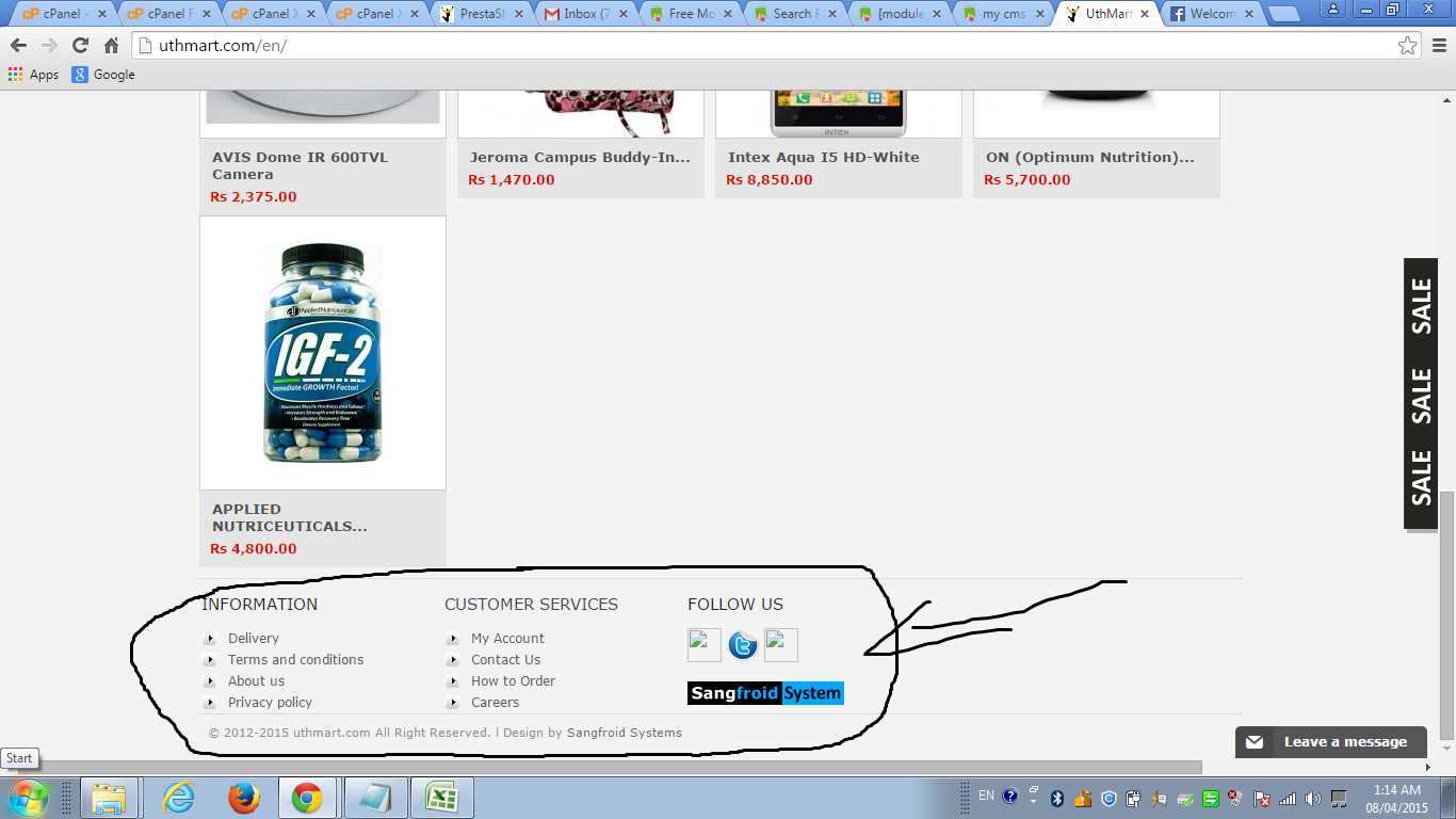Kriter.io Posted April 8, 2015 Share Posted April 8, 2015 Hello, Please help me to find social link images Tab. Actually its missing and now I am not found the exact location to correct this issue. Please check attached image for more details. I am trying to locate this file where I can edit or upload new image but not found any where in last 4 days. If anybody can give me the file name I will try to resolve it. My admin not able to help me now so I am fixing my all issues with help of forum. please please help me. its looks so bad on front page that images are crashed. I am using PS 1.4.8.3 and using cool-putih theme. Sorry for this types question but I am not much familiar with coding or developing. Hello Devendra, just click with RIGHT BUTTON of the mouse and click INSPECTION ELEMENT (it should be the last link of the menu that gets out when u right click) and you will see exactly where the images are, name and folders. Than go to that folder via FTP and replace them with the icons you prefer. I'm at ur disposal for any further support. falabby.it Link to comment Share on other sites More sharing options...