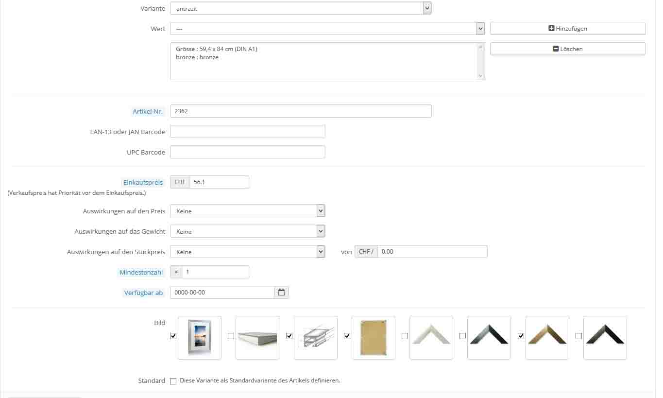 Ich verwende die Version 1.6.0.9 und habe bereits Bilder zu den jeweiligen Artikel hochgeladen. Bei den Varianten habe ich ebenfalls die Texturen hochgeladen welche für die jeweiligen Rahmen welche ich unter Bilder hochgeladen habe passend sind. Einen Artikel habe ich als Standard angewählt welcher den Rahmen in 3 verschiedenen Ansichten zeigt und in einer grauen Farbe.