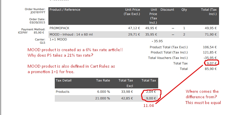 Bert Jans Posted April 9, 2015 Share Posted April 9, 2015 See screenshot attached of an invoice based on 2 products. Both products are created with a 6% tax rate. Line 2 - If you calculate the MOOD product , you'll get a 21% tax rate while it has to be 6% . I don't know where PS get this. Probably it comes form the Cart Rule module? The MOOD product is defined as a promotion product where you have 1+1 for free. I have also different tax amouts on the same invoice. This is not acceptable of caurse! Does anybody can help me? Link to comment Share on other sites More sharing options...