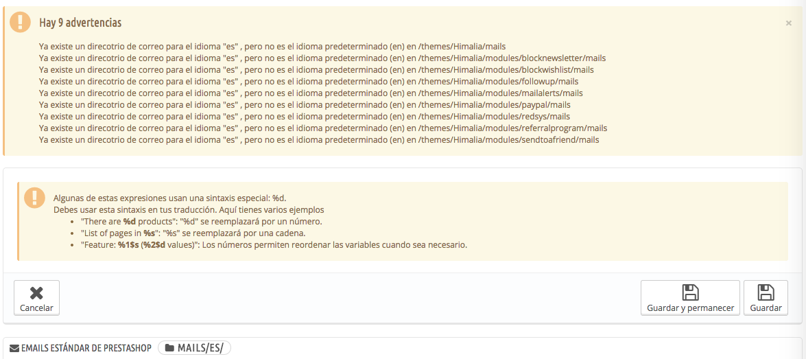 • Ya existe un direcotrio de correo para el idioma "es" , pero no es el idioma predeterminado (en) en /themes/Himalia/modules/blocknewsletter/mails