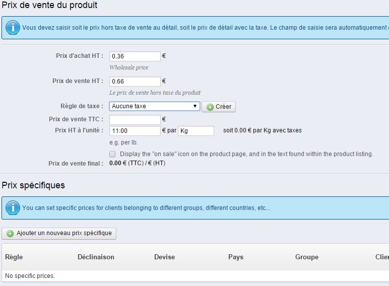 regis havond Posted September 22, 2015 Share Posted September 22, 2015 Re bonjour, toujours regis. Quelques precisions : Lorsque je crée les prix sur la fiche produit, si je rentre le HT et que je choisi TVA 20% par exemple, l'affichage du TTC ne se met pas à jour. Par contre après vérif, l'affichage sur le front est correct et le panier prend bien en compte la TVA à 20%. Par contre si je rentre le TTC d'abord, le HT ne se met pas à jour dans la fiche produit, mais le TTC est pris par la base pour du HT Link to comment Share on other sites More sharing options...