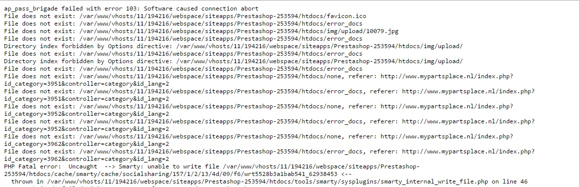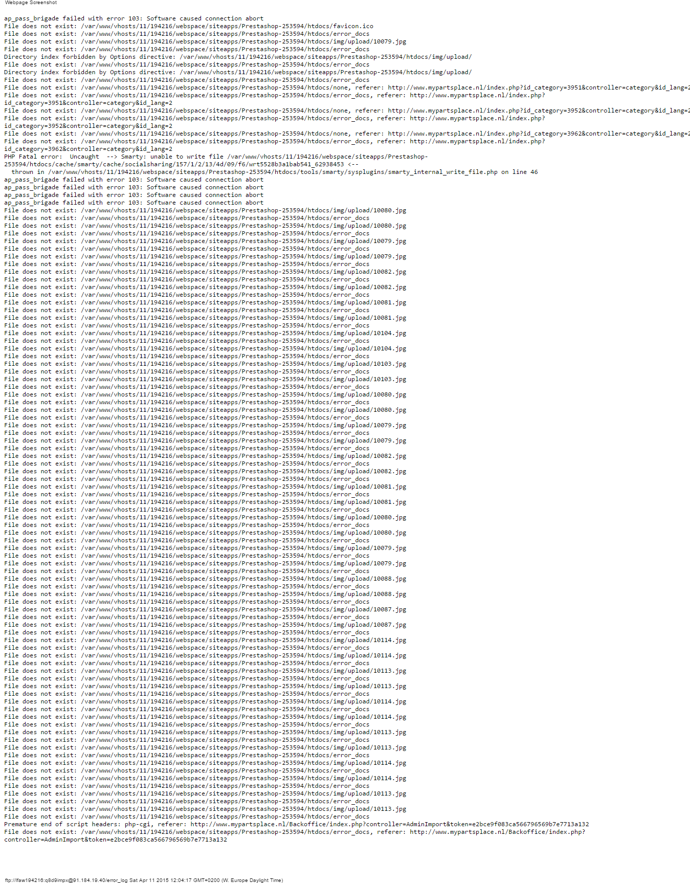 wimpie0050 Posted April 11, 2015 Author Share Posted April 11, 2015 now i have this error only: ap_pass_brigade failed with error 103: Software caused connection abort, referer: http://www.mypartsplace.nl/Backoffice/index.php?controller=AdminProducts&token=4ec7b537cf1416b2fdc894c07e667b05Premature end of script headers: php-cgi, referer: http://www.mypartsplace.nl/Backoffice/index.php?controller=AdminImport&token=e2bce9f083ca566796569b7e7713a132File does not exist: /var/www/vhosts/11/194216/webspace/siteapps/Prestashop-253594/htdocs/error_docs, referer: http://www.mypartsplace.nl/Backoffice/index.php?controller=AdminImport&token=e2bce9f083ca566796569b7e7713a132 Link to comment Share on other sites More sharing options...