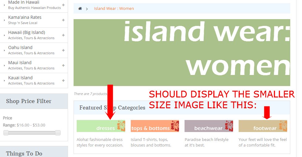 kamaaina Posted April 15, 2015 Author Share Posted April 15, 2015 (edited) Thank you, your help is really appreciated. It works great, but it displays the large image instead of the smaller size - see image below? This is what I added: <h1 class="page-heading{if (isset($subcategories) && !$products) || (isset($subcategories) && $products) || !isset($subcategories) && $products} product-listing{/if}"> <span class="cat-name"> <img src="{$link->getCatImageLink($category->link_rewrite, $category->id_image, 'category_default')|escape:'html':'UTF-8'}"/> <!-- {$category->name|escape:'html':'UTF-8'}{if isset($categoryNameComplement)} {$categoryNameComplement|escape:'html':'UTF-8'} -->{/if} </span></h1> Edited April 15, 2015 by kamaaina (see edit history) Link to comment Share on other sites More sharing options...