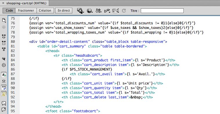 Je suis actuellement en développement d'une boutique basée sur Prestashop 1.6.0.11 et du thème POS_OPTIMA. J'aimerais modifier la page "Panier", tout simplement réduire la taille du tableau qui constitu cette page. J'ai modifié la page "shopping-cart.tpl" présente dans mon dossier thème, afin d'ajouter des class aux éléments que je souhaiterais modifié et qui n'en ont pas.