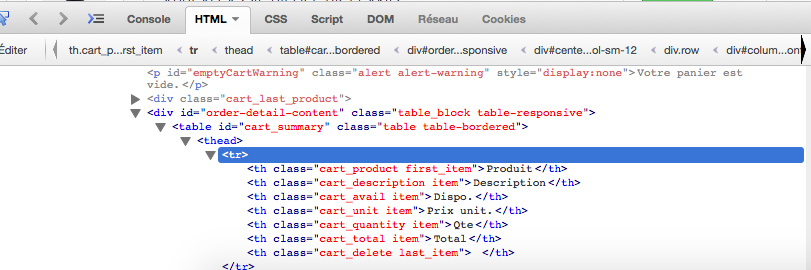 J'ai donc ajouter la class "headtabcart" à ce <tr> au sein du fichier shopping-cart.tpl mais les modifications n'ont pas été prise en compte (comme vous pouvez voir, le <tr> reste vide sans ma classe).