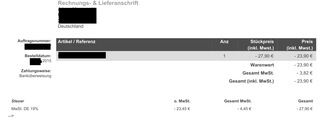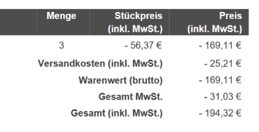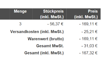 Sieht schon besser aus. Bleibt noch der Fehler bei den Versandkosten. Richtig wären hier inkl. MwSt. 30€. Gerechnet wird aber hier ohne mwst. So fehlt mir am Ende in diesem Beispiel die Differenz von 4,79€.