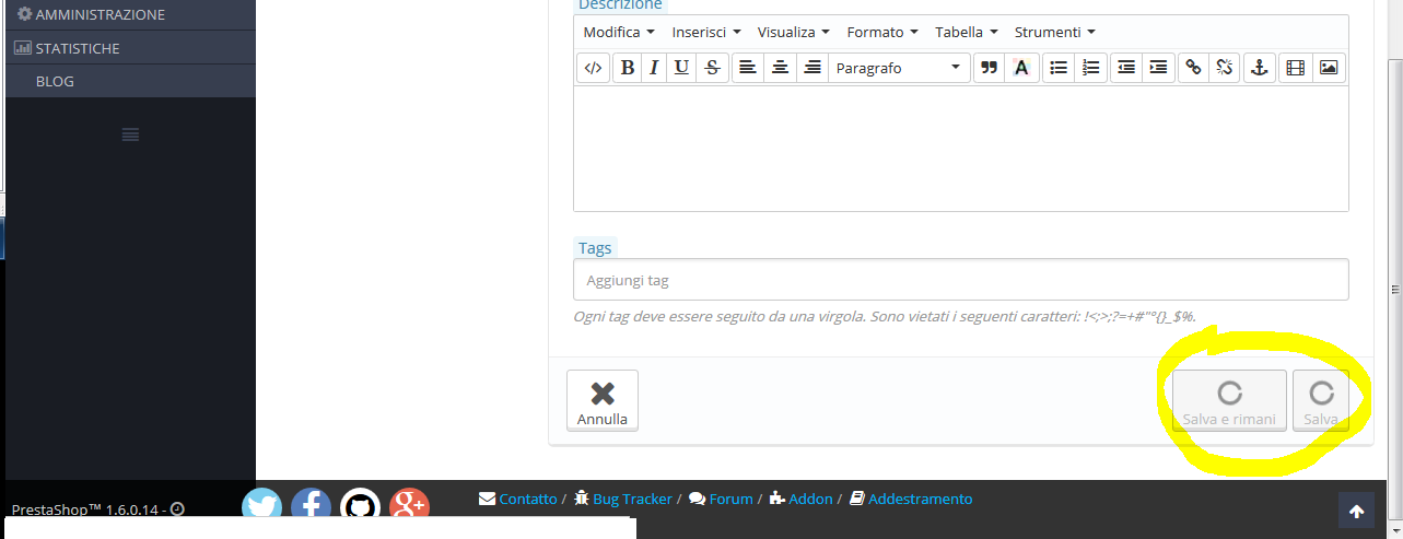 Nel backend di prestashop 1.6.0.14 durante l'inserimento ma soprattutto durante la modifica di un prodotto, il tasto "Salva" e "Salva e continua", restano bloccati (freeze) e non si può salvare. Succede random. Ho cercato soluzioni e sembra che sia un problema risolto dalla 1.6.0.12, ma ho un utente bloccato con questo problema.