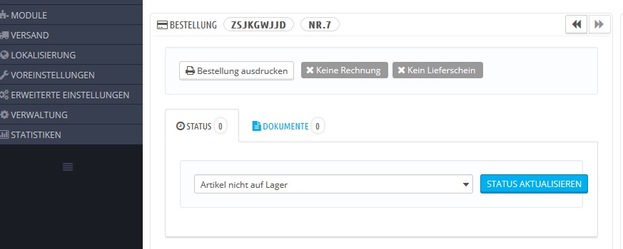 Da hat Prestashop noch deutlich Nachholbedarf, denn hinter dem Button Bestellung ausdrucken verbirgt sich nur eine einfache Javaskript-Funktion, die den aktuellen Bildschirminhalt ausdruckt. Das Ergebnis ist je nach Länge der Bestellung bescheiden bis grauenhaft.