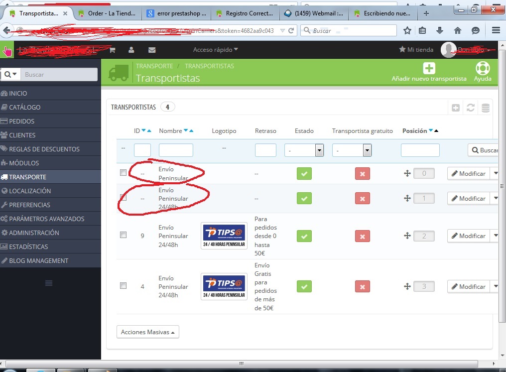 BaNt Posted April 20, 2015 Share Posted April 20, 2015 (edited) Hola, Soy nuevo en esto y hasta ahora había podido solucionar los problemas por mi cuenta pero me he encontrado con algo que me supera y os agradecería ayuda. Se me han duplicado 2 transportistas, SIN ID ni ningún otro campo, y no me es posible eliminarlos y aparecen en el proceso de finalizar la compra en el front office y no me interesa.Si que los puedo modificar pero al hacerlo me crea otro transportista nuevo y el bugeado queda intacto y no puedo solucionar el problema ya que he leido que posiblemente se deba a que se han creado por accidente sin ID u otros campos y no hay manera de borrarlos en el back office. También leí que posiblemente tenga que modificar la BD y sinceramente sobre esto no tengo ni idea, y no quiero tocar algo que no deba y tenga que reinstalar prestashop desde inicio y perder semanas de trabajo, por lo tanto si me podeis indicar que pasos debo seguir os lo agradezco mucho. Estoy usando prestashop 1.6 , adjunto una foto del problema en cuestión: http://i59.tinypic.com/116i5ja.jpg http://i60.tinypic.com/2hfm4ia.jpg gracias de antemano - Solucionado - Edited April 20, 2015 by BaNt (see edit history) Link to comment Share on other sites More sharing options...