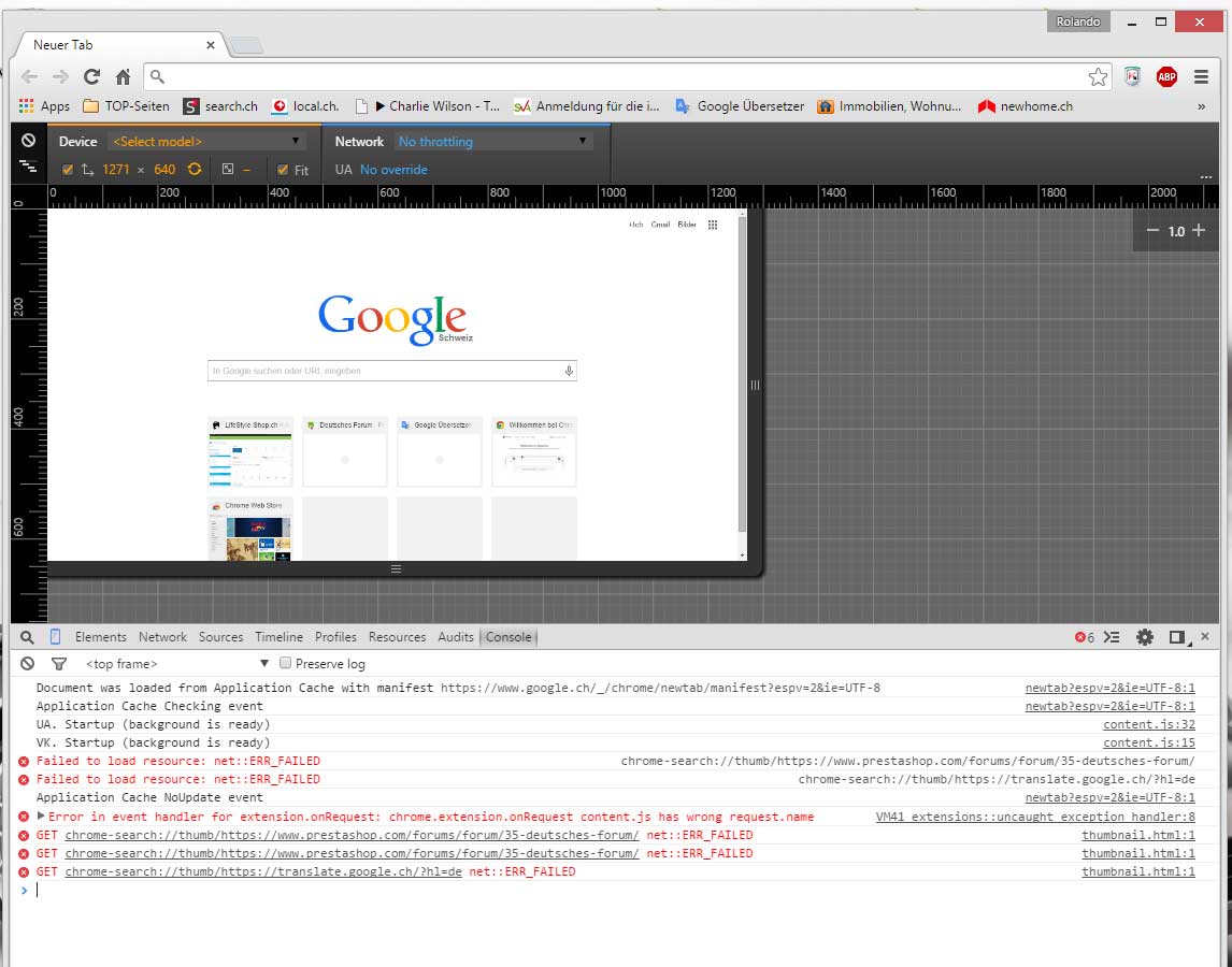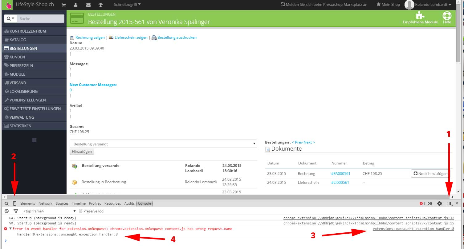 Birel34 Posted April 21, 2015 Author Share Posted April 21, 2015 Hallo und guten Morgen Zuerst möchte ich mich entschuldigen, dass ich in diesem Umfeld zu wenig oder besser gesagt keine Erfahrungen habe. Dass die Bilder zu wenig aussagen, kann ich verstehen. Sorry. Du musst den "Device Mode" abschalten (kleine Display Symbol in der oberen rechen Ecke der Console). Wenn ich auf das Symbol in der oberen rechten Ecke darauf klicke, wird nur das Fenster seitlich dargestellt. (1) Habe gegooglet und die schreiben, dass das Symbol (2) nicht aktiv sein sollte, wenn ich es richtig verstanden habe. Danach habe ich ein neues Fester aufgemacht und die Url von der Seite direkt eingegeben, also ohne Umwege. Wenn ich nun auf die Zeile (3) klicke kommt nichts. Und wenn ich auf die Zeile (4) klicke, geht ein neues Fenster auf mit der Meldung: "Unbekannt: extensions::uncaught_exception_handler". Herzliche Grüsse Rolando Link to comment Share on other sites More sharing options...