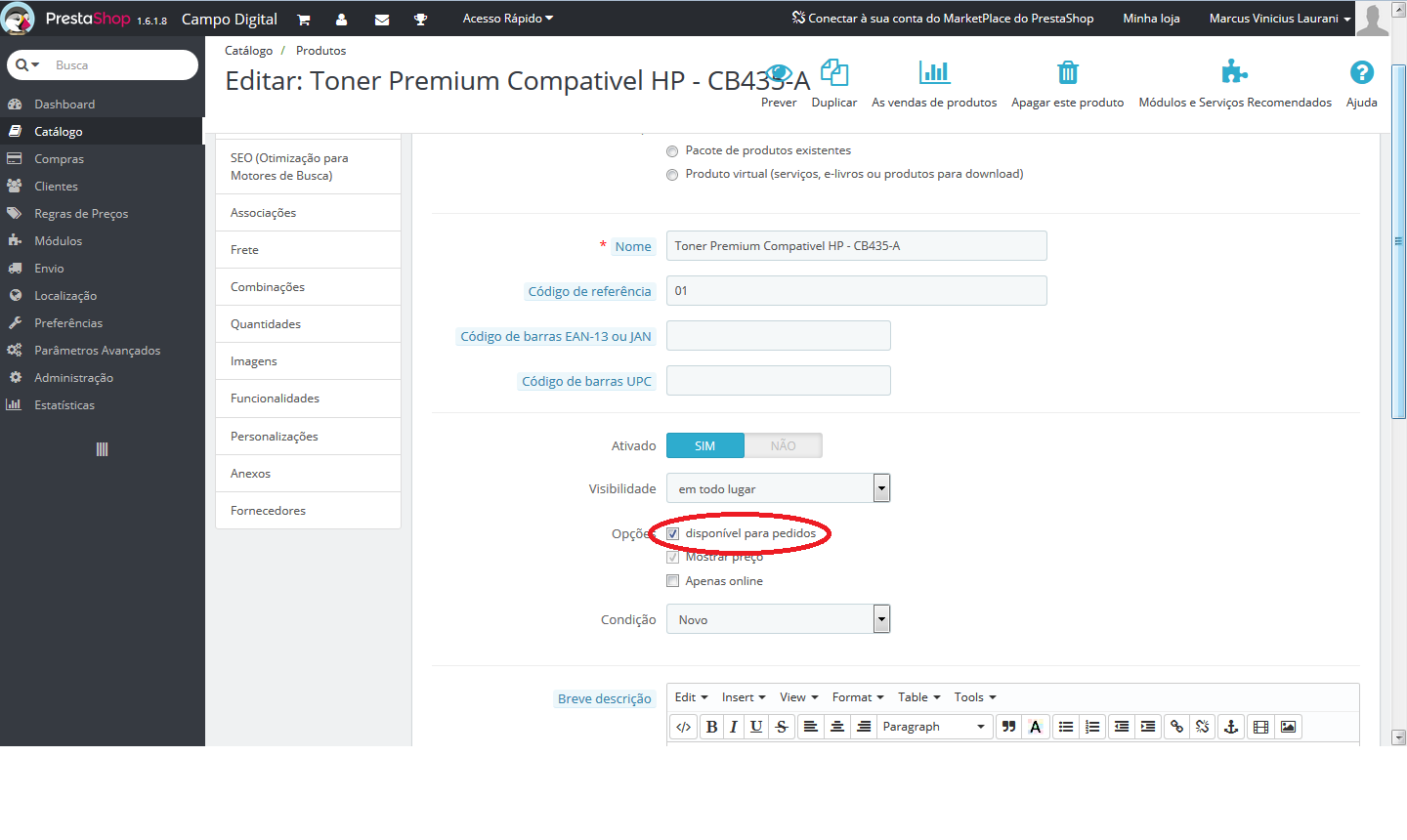 marcusl Posted November 18, 2016 Share Posted November 18, 2016 (edited) Obrigado pela ajuda! Analisando as respostas anteriores com calma, acabei achando o erro... Em Catalogo -> Produtos ; Opções, não tinha marcado "Disponível para pedidos". Aliás, sabe dizer o que seria "Apenas online" ? Edited November 18, 2016 by marcusl (see edit history) 1 Link to comment Share on other sites More sharing options...