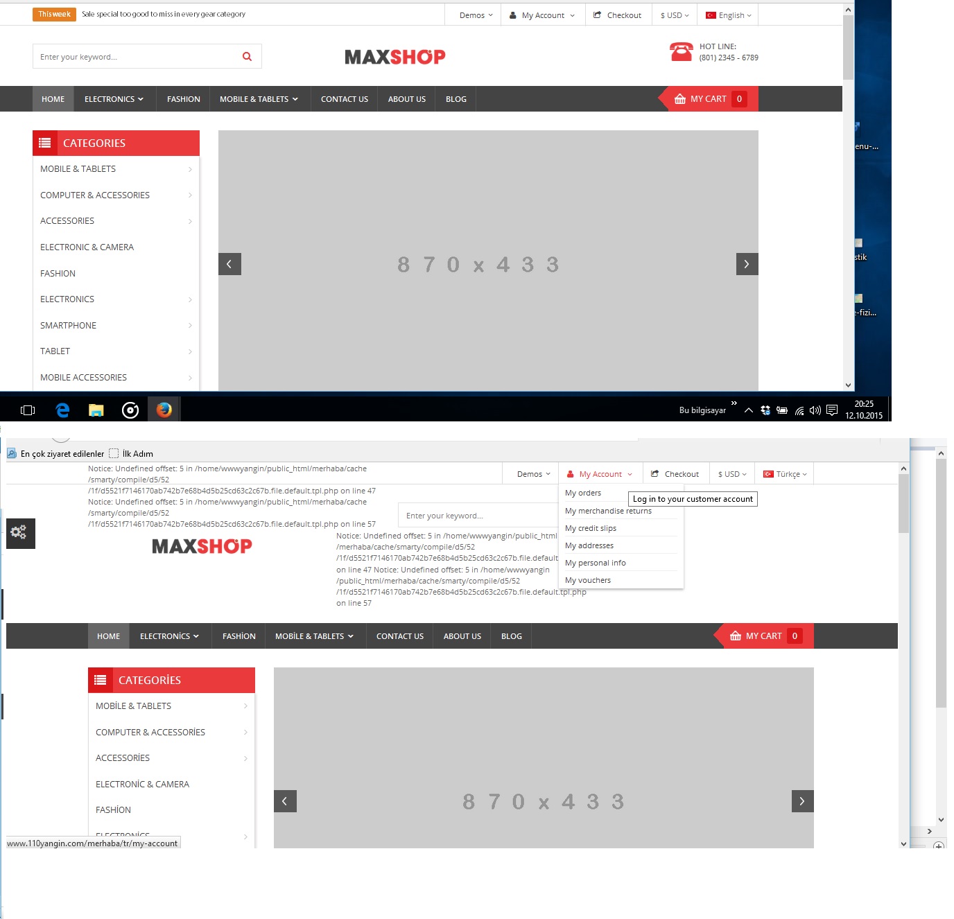 expertixs Posted October 12, 2015 Share Posted October 12, 2015 (edited) Yanıtınız için Teşekkür ederim. Evet tema özel ücretli bir tema. Alırken de bazı yerlerde türkçe de sorun yaşanabileceği söylenmişti fakat bu kadarını da açıkçası beklemiyordum. Ekteki ekran resmin de de göreceğiniz gibi üst kısım ingilizce, alt kısım türkçe seçili iken alındı. Ayrıca admin panelim hala ingilizce. Tek türkçe olan yer sayfanın en altında bulunan Hesabım ve Bilgi başlk ve alt başlıkları. Edited October 12, 2015 by expertixs (see edit history) Link to comment Share on other sites More sharing options...