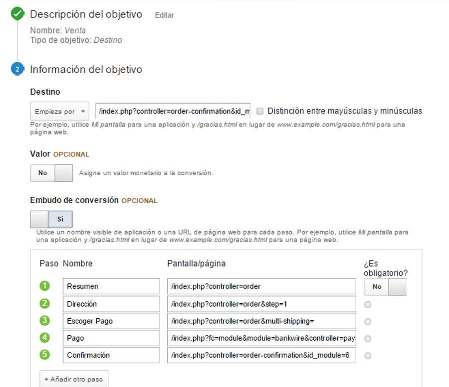 Lili8 Posted April 22, 2015 Share Posted April 22, 2015 Hola Tengo un problema con los objetivos en Google Analytics que estoy creando para la compra que realizan mis clientes en mi Prestashop. He realizado las compras desde las tres opciones de pago: transferencia, tarjeta de crédito y Paypal y copié todas las urls de cada proceso para ponerlas en los objetivos en el "Embudo de conversión" pero no me está dando resultados porque me refleja el porcertaje de conversión en 0 de cada uno de ellos. Al principio intenté poniendo la url de "destino" sin la etiqueta de module porque era la raiz de la url final pero me estaba dando los mismo resultados en todos los objetivos así que agregué lo del "&id_module=6" al objetivo de venta porque es la etiqueta usada en la compra de ese tipo pero ahora no refleja nada. ¿Qué debo hacer o cambiar para mejorar la configuración de mis objetivos? Link to comment Share on other sites More sharing options...