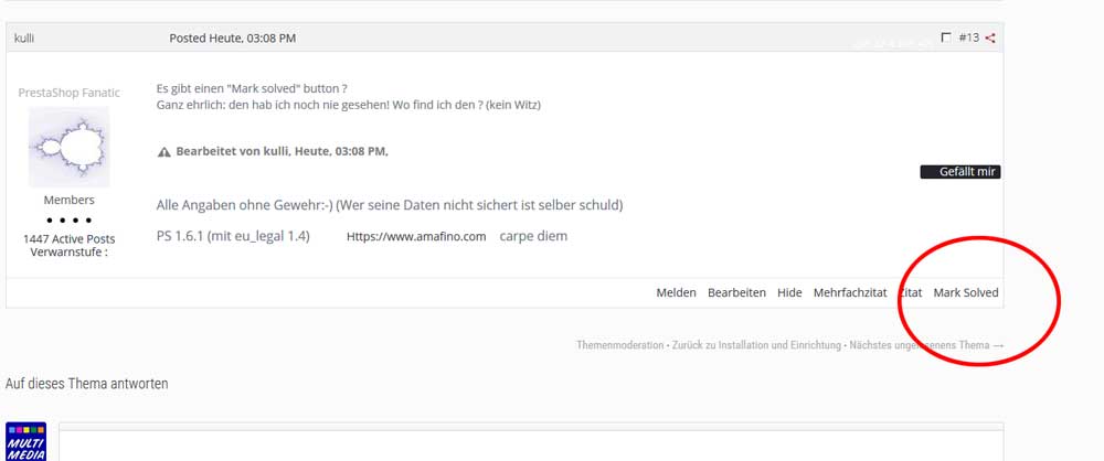 Aeneas63 Posted April 24, 2015 Author Share Posted April 24, 2015 Ich mag Prestashop, auch wenn das BO ziemlich anstrengend ist, weil hier vieles unlogisch angeordnet ist und sich nicht auf den ersten Blick erschließt. Aber das System kann mehr als man am Anfang denkt. Daher ein klares pro für Prestashop. Der Ton in diesem Forum und die Ausführlichkeit bei der Beantwortung lässt aber teilweise schwer zu wünschen übrig. Hier wäre etwas mehr Höflichkeit angebracht. Schließlich habe ich niemandem etwas getan oder mich unhöflich verhalten!!! Zu der Anmerkung: Warum soll ich mich als Nichtprogrammierer an eine php-Datei machen, wenn es auch im BO geht. Die von mir beschreibene Lösung führt jedenfalls genau zu der von mir gewünschten Lösung und ist für den Laien der hier etwas sucht sicher keine schlechte Lösung für das Problem. Ich habe auch nichts als "beste Antwort" deklariert, sondern habe nur versucht die Frage als "beantwortet" zu deklarieren - und für mich als Fragesteller ist die Frage hinreichend beantwortet. "Marked as Solved" heißt für mich: "als gelöst markiert. Link to comment Share on other sites More sharing options...