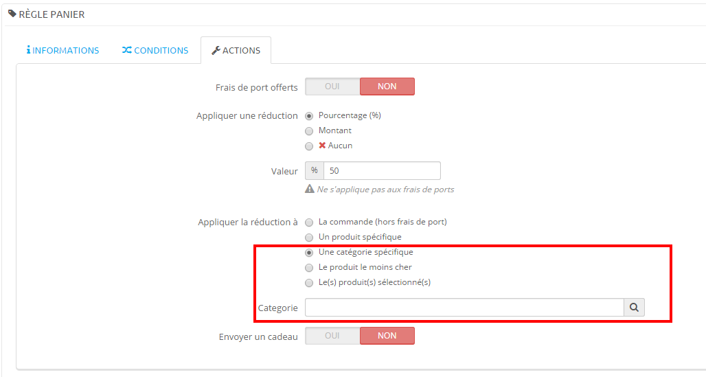 wouababelouba Posted April 23, 2015 Share Posted April 23, 2015 (edited) Bonjour à tous, Je travaille sur la version 1.6.0.14, et j'aimerais pouvoir appliquer l'action d'une règle panier à une catégorie, plus précisément appliquer une réduction sous forme de pourcentage pour tous les produits d'une catégorie. Or seules les options suivantes sont disponibles dans l'onglet "ACTIONS" > "Appliquer la réduction à" : La commande (hors frais de port) Un produit spécifique Le produit le moins cher Le(s) produit(s) sélectionné(s) De la même façon que pour "Un produit spécifique", j'aimerais pouvoir choisir une catégorie par autocomplétion dans un champ qui apparaîtrait après avoir cliqué sur le bouton radio. Avant de me lancer dans un override qui risque d'être galère, j'aimerais savoir si personne n'a eu le même besoin que moi ? J'ai déjà regardé, en modifiant le fichier AdminCartRulesController.php et le tpl associé actions.tpl (dans le thème de l'admin puis themes/default/template/controllers/cart_rules/), on peut facilement ajouter le choix "Une catégorie spécifique" à la liste existante (voir ci-dessous), reste ensuite à traiter l'autocomplétion et l'enregistrement/l'application de la réduction à la catégorie etc. Merci par avance ! Edited April 23, 2015 by wouababelouba (see edit history) Link to comment Share on other sites More sharing options...