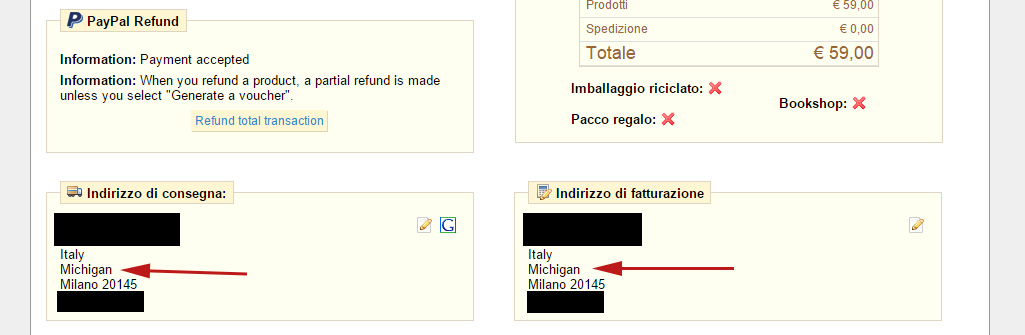 simonedev Posted April 23, 2015 Share Posted April 23, 2015 Good evening every time a customer from Milan (Milano, Italy) buy an object from the store, the address is not show properly. As you can see in the attached picture, there's a line showing "MICHIGAN", just like Milan were in U.S.A. Any hint?Every other Italian city works fine... so I believe there's nothing wrong in the prestashop code. thanks Link to comment Share on other sites More sharing options...