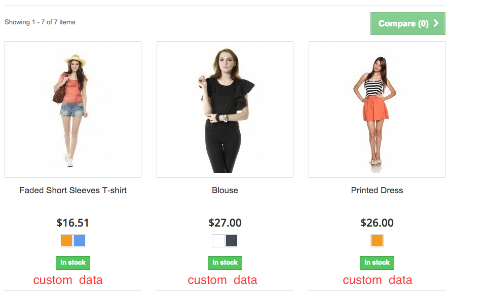 j.k.r Posted April 24, 2015 Share Posted April 24, 2015 I'm working on a custom module that should display its contents on each product that is currently visible on the screen. For example, in the demo store, if you click on "Women", you see all the products for women listed. I'd like my module to be displayed below green "In Stock" box or below the product price for each displayed product. Is there a hook available to do this? All of the product display hooks I've tried are only for when a specific product has been selected. Please look at the attached screenshot to see where I'd like my module to output data to. Thanks! Link to comment Share on other sites More sharing options...