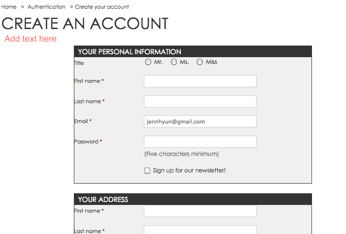 jhyun Posted April 30, 2015 Share Posted April 30, 2015 Hello, I would like to know if it is possible to add instructional texts in the Account Creation page. When a customer is interested in creating an account, I would like to provide some instructions before they submit their personal data. I've attached the screenshot of where I would like to add the text in red. I know that I'm supposed to edit the authentication.tpl and insert {l s=''}, but I'm exactly sure where I should be adding this code. Thank you! Jennifer Link to comment Share on other sites More sharing options...