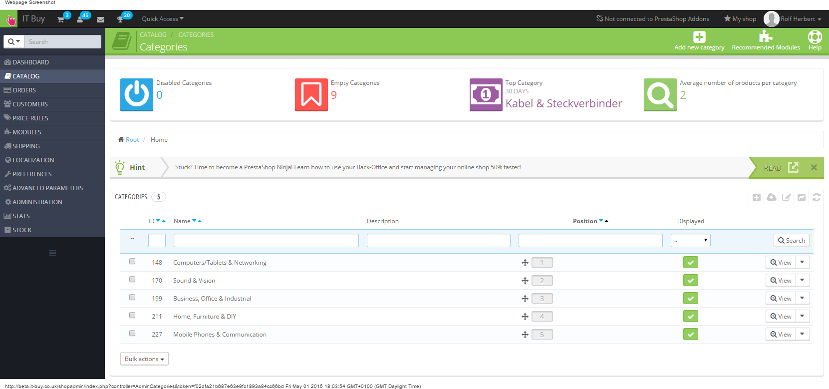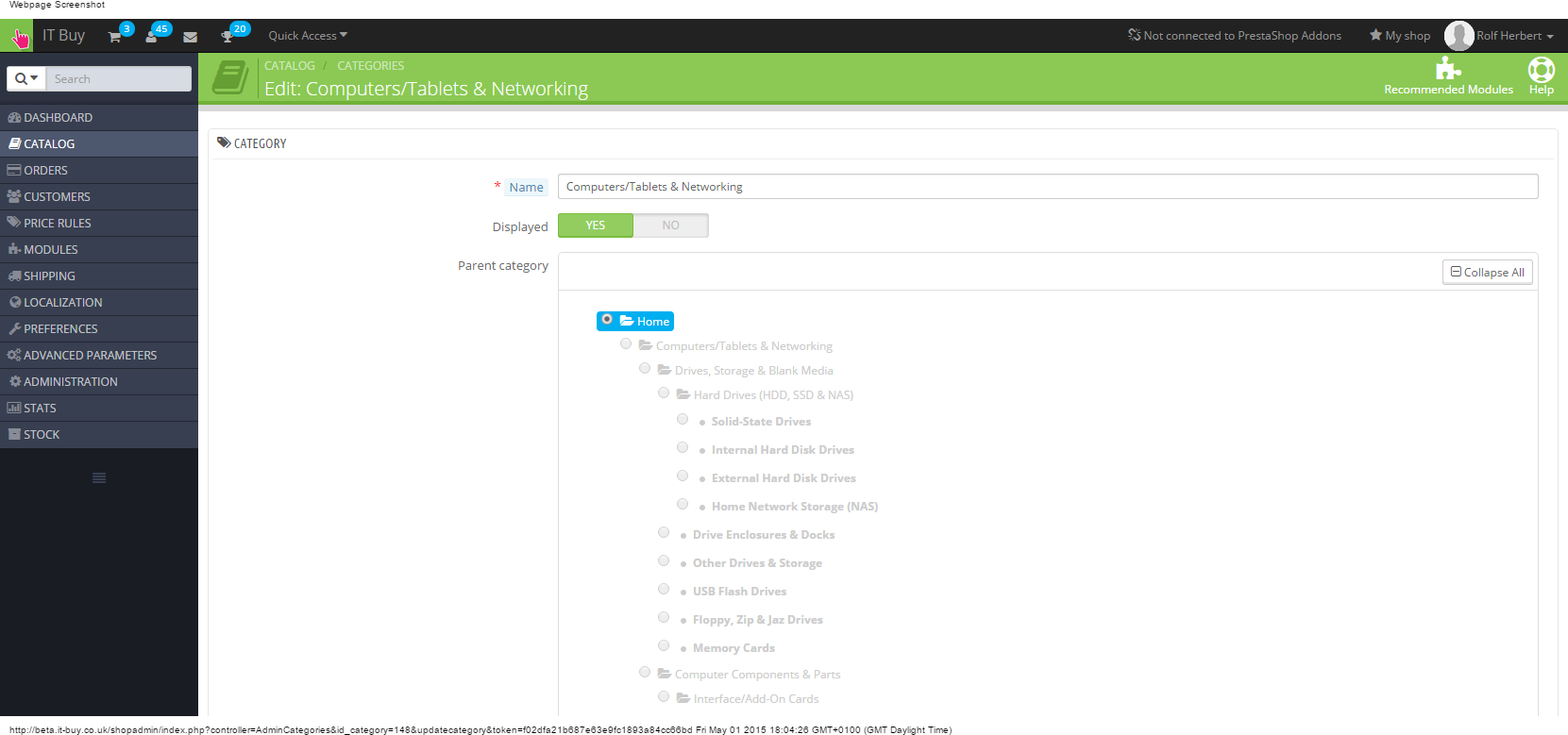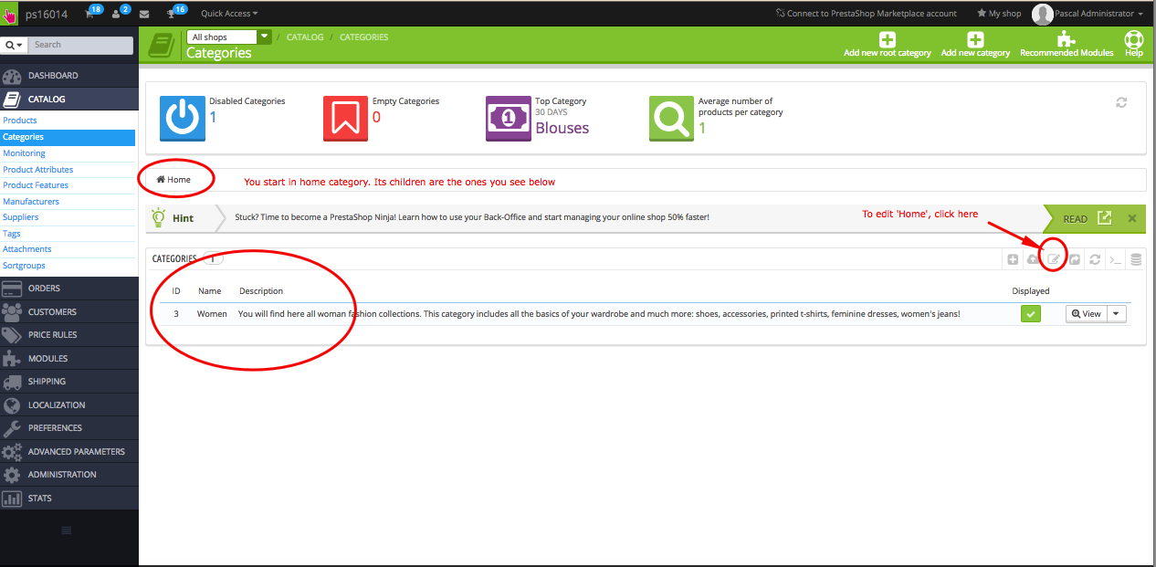 PascalVG Posted May 2, 2015 Share Posted May 2, 2015 (edited) The Home category, is the start category for your shop. To edit the Home category (for example, if you would like to rename 'Home' or so), click on the little edit icon on the right (see image) The categories on the start page when editing categories, are the children of the home category, which in turn can have their own children etc. All these categories you will make yourself. About the cache: Random showing the products indeed doesn't seem to work with cache on. The problem is, that getting the products is time consuming (quite a complex SQL statement, which needs to go through many table, SQL functions are called inside the statement etc), which, if you have many products, may slow down the page loading dramaticaly. Therefore they opted to use the caching here, I think. If you can live with the slower loading, you may try this (Didn't test it myself, but give it a try) in file: modules/homefeatured/homefeatured.php (Make backup!!) There is a function: (Sample from SP 1.6.0.14) public function _cacheProducts() { if (!isset(HomeFeatured::$cache_products)|| Configuration::get('HOME_FEATURED_RANDOMIZE')) { $category = new Category((int)Configuration::get('HOME_FEATURED_CAT'), (int)Context::getContext()->language->id); $nb = (int)Configuration::get('HOME_FEATURED_NBR'); if (Configuration::get('HOME_FEATURED_RANDOMIZE')) HomeFeatured::$cache_products = $category->getProducts((int)Context::getContext()->language->id, 1, ($nb ? $nb : 8), null, null, false, true, true, ($nb ? $nb : 8)); else HomeFeatured::$cache_products = $category->getProducts((int)Context::getContext()->language->id, 1, ($nb ? $nb : 8), 'position'); } if (HomeFeatured::$cache_products === false || empty(HomeFeatured::$cache_products)) return false; } Add the red code, and see if that helps. Let me know. pascal. P.S. If this works, we will need to do something similar in other modules, like blocknewproducts, blockspecials. Maybe see if you can find tis yourself here. If not, let me know and I will see what I can do. Edited May 2, 2015 by PascalVG (see edit history) Link to comment Share on other sites More sharing options...