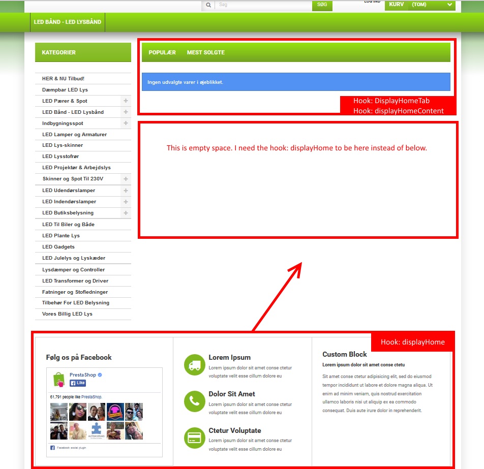 As you can see on the attached image the displayHome hook is not showing the right place. I need it to be placed in the center column right next to the left column. Instead it is showing below left column.