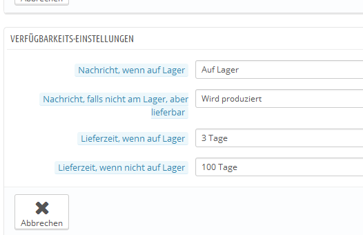 anhaefr Posted May 4, 2015 Author Share Posted May 4, 2015 (edited) Hi Luca, genaus da liegt der Hase im Pfeffer. Deine Anzeige zur Lieferbarkeit schaut so aus: Bei mir schauts im frisch installierten Shop mit EU_legal standardmäßig so aus: Deswegen gehe ich davon aus, dass mein Shop nur 2 Lieferzeitangaben beherrscht, nämlich "verfügbar" und "nicht verfügbar", wie im EU_Legal angegeben. Das Feld "Nachricht, wenn auf Lager" ist eigentlich für die Verfügbarkeitsinfo ob am Lager / Im Zulauf / sonstiges gedacht. Natürlich kann man sich dort auch mit der Angabe der Lieferzeit behelfen, was aber ein Workaround ist. Für die Angabe der Lieferzeiten würde ich mir dann auch ein Dropdownfeld wünschen, um nicht bei jedem Artikel die dementsprechende Info händisch eintippen oder einkopieren zu müssen. Wegen der Zahlungsaufschläge, mir geht es darum, dass es auch mit Payment Fee Modul nicht möglich ist, zonenabhängig unterschiedliche Gebühren zu konfigurieren. Es geht pro Zahlmöglichkeit nur global mit Gebühr oder eben ohne. Da die üblichen Verdächtigen wie Paypal oder Skrill zonenabhängige Gebüren veranschlagen, sollte dies ein Shop auch können, was eben systembedingt nicht funktioniert. Natürlich auch ein Dank an Gurkcity! Ich habe das Modul bei Silbersaiten runtergeladen und hatte die Historie noch nicht so auf dem Radar... Viele Grüße Frank Edited May 4, 2015 by anhaefr (see edit history) Link to comment Share on other sites More sharing options...