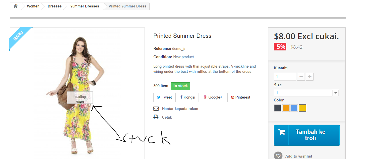 MaXi32 Posted May 2, 2015 Share Posted May 2, 2015 (edited) Hi, I'm using the latest prestashop v 1.6.0.14 to build an online clothing store. When I click on a product, select the size attribute, the jqzoom message popup with a title "Loading zoom" and stuck there (unable to zoom).. as shown in the attached file: By the way you can also try out this demo site. I have enabled jqzoom at the back-end. Here are the steps to reproduce the error: 1) Try out with the latest browser version Google Chrome / Opera 2) Go to http://anikapakaian.pswebstore.com/ 3) Click on any Printed Summer Dress 4) Select different size. Example: 'Size L' 5) "Loading zoom" text appear and stuck there. How to solve this problem ? Edited May 3, 2015 by arafatx (see edit history) Link to comment Share on other sites More sharing options...