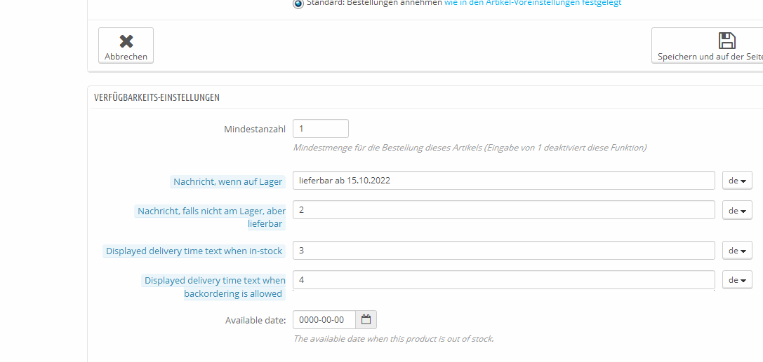 kulli Posted May 4, 2015 Share Posted May 4, 2015 (edited) Unter Katalog - Artikel - mengen unten unter Verfügbarkeitseinstellungen hast Du 5 allerdings Lager- und eu_legal abhängige Einstellungen: der ergebnis siehts du dann hier: https://amafino.com/de/home/549-testartikel-1234567891234.html das mit dem available date hab ich noch nicht ausprobiert Edited May 4, 2015 by kulli (see edit history) Link to comment Share on other sites More sharing options...