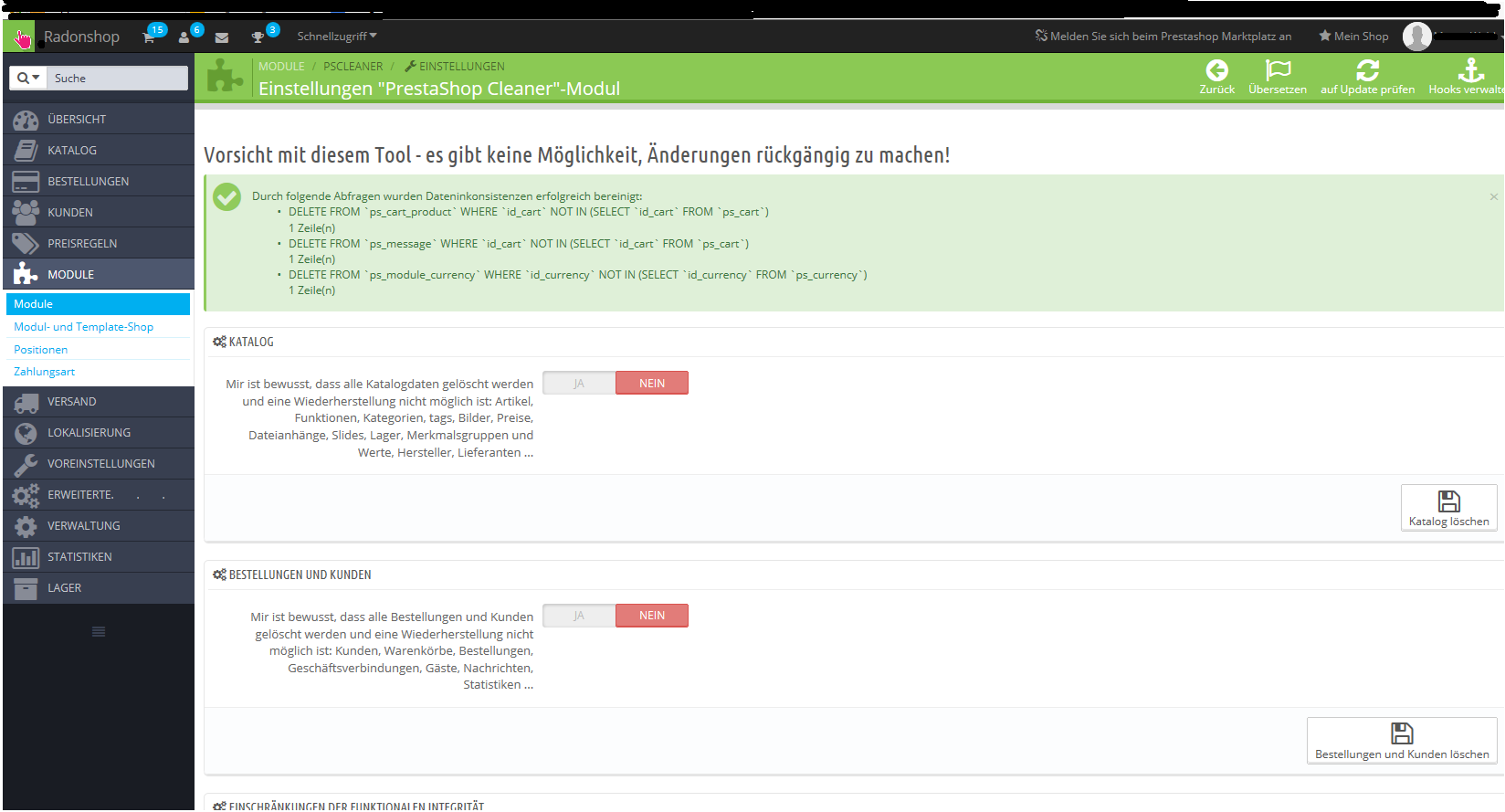 Dr.Radon Posted May 4, 2015 Share Posted May 4, 2015 Hallo zusammen, ich hatte jetzt über längere Zeit das Problem, dass das paypal express Modul immer wieder nicht funktioniert hat und man nach dem Drücken des Buttons bezahlen (wo man normalerweiße auf paypal kommt) auf einer blank page gelandet ist. Der hotfix war relativ einfach, paypal modul deinstallieren und wieder neu drauf machen und konfigurieren. Ich hab jetzt rausgefunden, dass der PrestaShop cleaner zu viel löscht und dadurch dieses Problem verursacht, siehe Screenshot. Man findet zu dem Thema blank page paypal modul viele Leute mit Problemen, jedoch fand ich in keinem der Beiträge den Hinweis mit dem Cleaner. Hoffe, es hilft. Gruß Link to comment Share on other sites More sharing options...