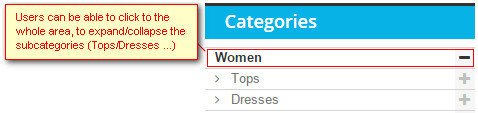 Peda Posted May 6, 2015 Share Posted May 6, 2015 (edited) Hello I am using latest version of PrestaShop. Currently I am clicking "+" and "-" symbols to expand/collapse subcategories on left column. Is it possible to click on a category name to expand/collapse subcategories? I researched solution, someone threads saying edit "category-tree-branch.tpl" or "blockcategories.tpl" and some of them are saying edit "treeManagement.js" file. But I could not succeed and found a clear solution. Regards Edited May 6, 2015 by Peda (see edit history) Link to comment Share on other sites More sharing options...