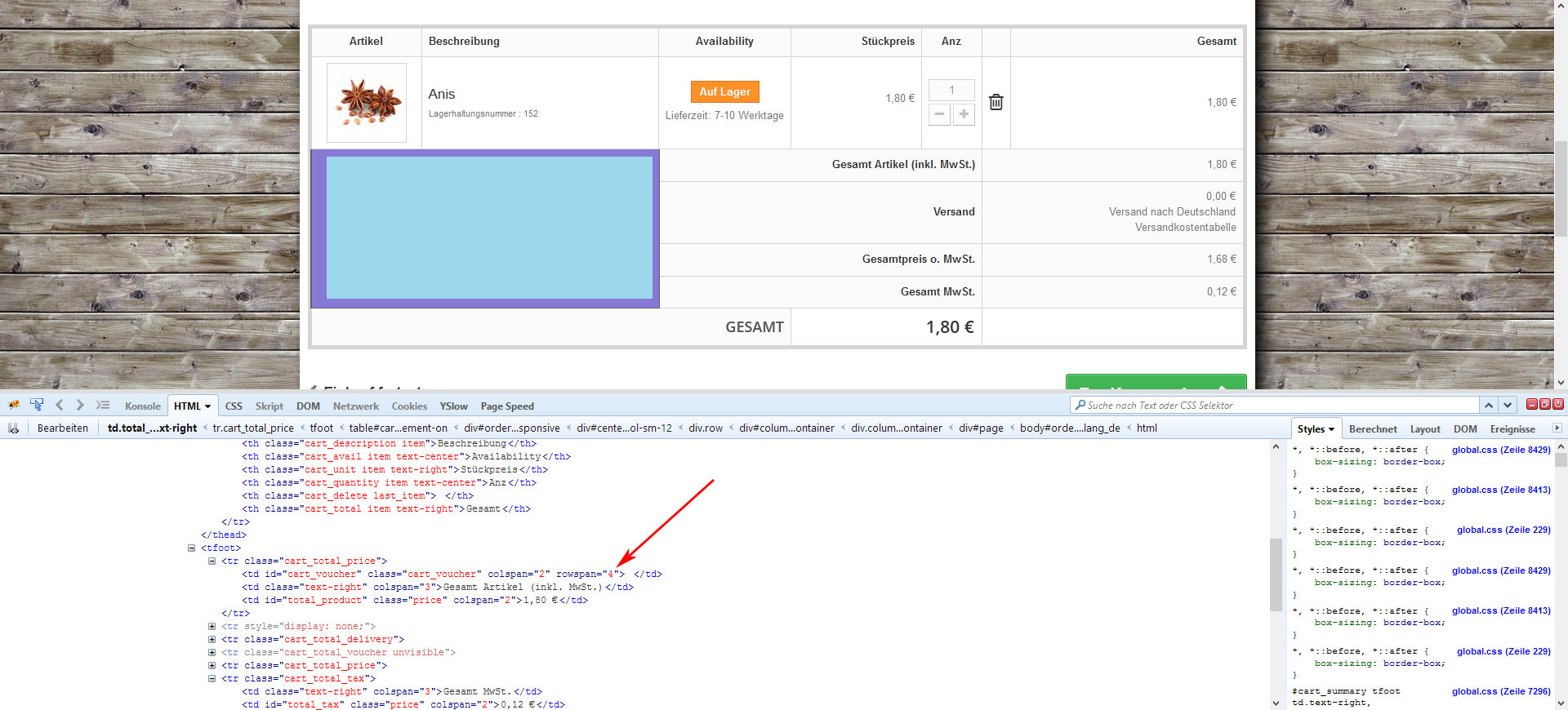 flipper242 Posted May 7, 2015 Share Posted May 7, 2015 Moin, sobald ich "MwSt. im Warenkorb anzeigen" unter Steuersätze anschalte ist in der Bestellübersicht ein Darstellungsfehler, der durch eine falschen Tabellen rowspan ausgelöst wird. Cache leeren und neu kompilieren ändert nichts. Im Template steht <td rowspan="{$rowspan_total}" colspan="3" id="cart_voucher" class="cart_voucher"> wird also wohl falsch inkrementiert oder so. Installiert ist Presta *.0.14, abgewandeltes original Template (nur css), Eu-Legal 1.4 Danke für Ratschläge Link to comment Share on other sites More sharing options...